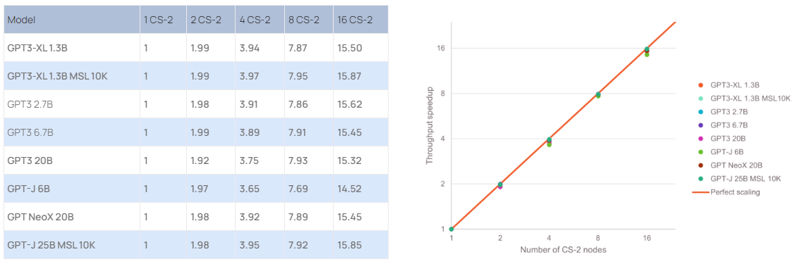По заявлениям Cerebras, производительность системы превышает 1 Эфлопс на т.н. разреженных вычислениях и достигает 120 Пфлопс при обычных FP16-вычислениях. Это первый в мире суперкомпьютер, который обеспечивает практически идеальное линейное масштабирование при работе с GPT-моделями, в частности, GPT-3, GPT-J и GPT-NeoX. Иначе говоря, при каждом удвоении числа комплексов CS-2 время обучения моделей сокращается почти в два раза.