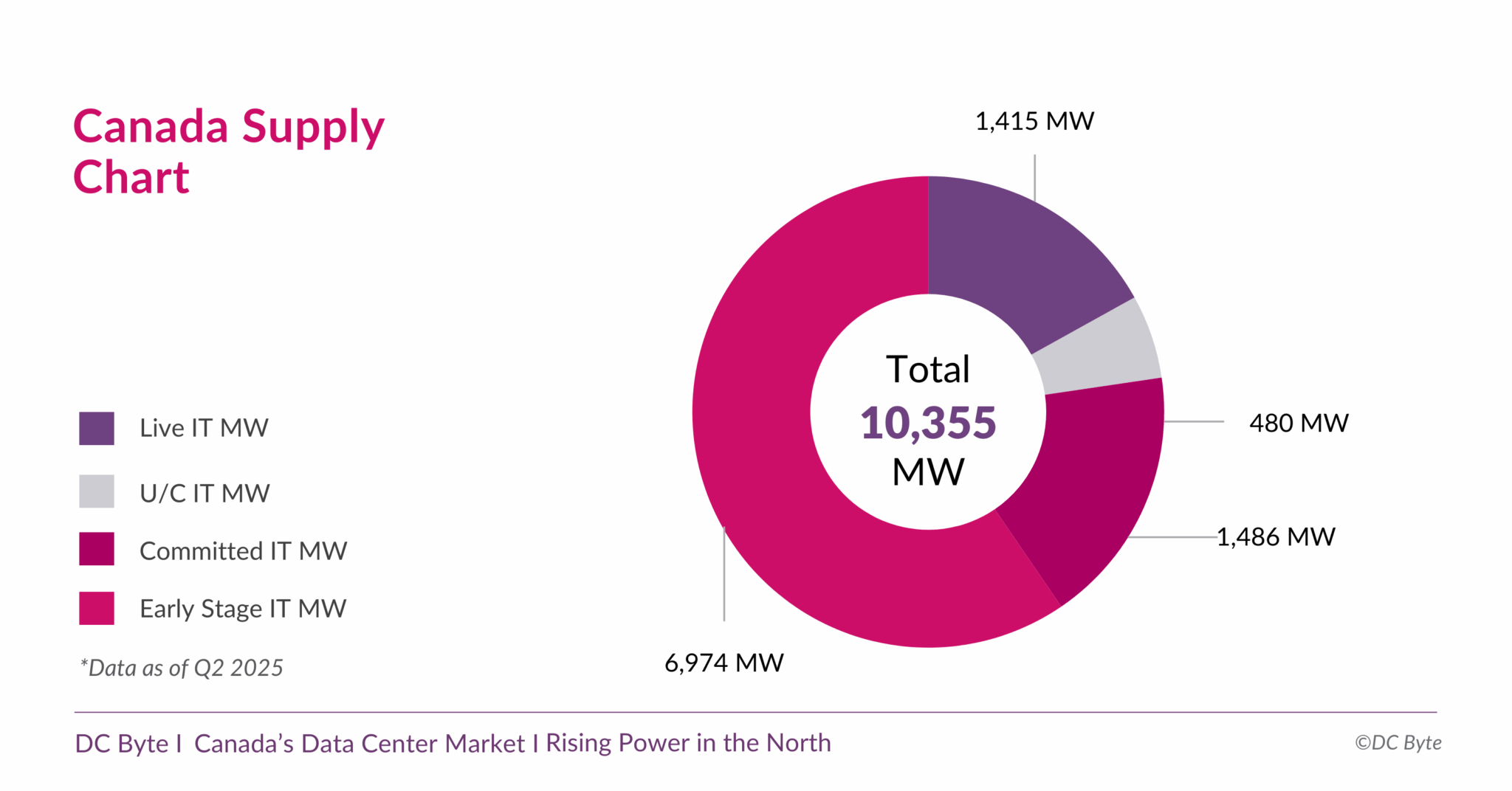 Канада готовится к новой фазе развития рынка дата-центров. В отчёте аналитического агентства DC Byte говорится, что общая ёмкость рынка ЦОД в обозримом будущем вырастет до 10,3 ГВт с нынешних введённых в эксплуатацию 1,4 ГВт. Проекты общей мощностью 8,9 ГВт находятся на разных этапах реализации, их них 6,9 ГВт — на ранних этапах без фактического начала строительства.