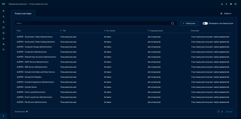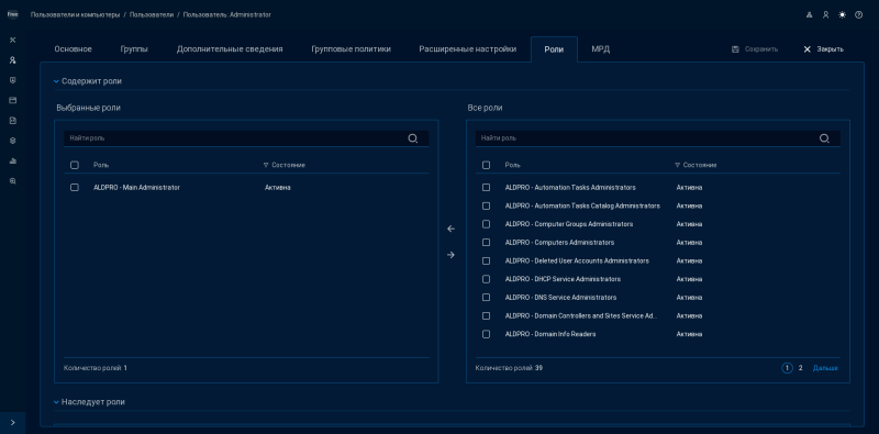 Сам по себе домен ALD Pro использует ролевую модель управления доступом администраторов к тем или иным параметрам или модулями, т.е. областям действия. Для управления каждым типом объектов каталога задаётся отдельный набор привилегий: чтение (Read), создание (Create/Add), изменение (Modify), удаление (Drop/Delete) или же даются полные права Manage. Роли включают набор заданных (из коробки или вручную) привилегий. Таким образом, можно назначать права доступа администраторов с довольно высокой гранулярностью, в том числе на управление объектами конкретных организационных подразделений.