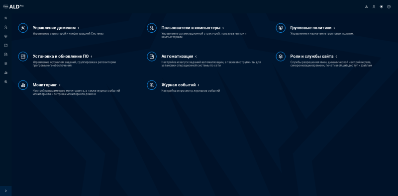 В целом ALD Pro предоставляет централизованное управление учётными записями пользователей и компьютеров, а также управление конфигурациями систем в домене через применение групповых политик. Посредством последних возможна установка и удаление ПО на машинах, а также использование собственных репозиториев. Для пущего удобства реализовано автоматическое развёртывание ОС на машинах в локальной сети с последующим введением в домен и включением функции удалённого доступа даже в редакции Free. Традиционно имеется управление печатью и общим доступом к файлам в сети предприятия. Базовые сетевые службы представлены собственными серверами DNS, DHCP и NTP. Естественно, доступны мониторинг и журналирование, в том числе с выгрузкой данных сторонним системам обеспечения информационной безопасности.