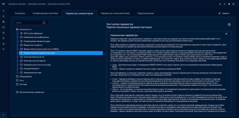 Разработчики также рекомендуют отключать локальные учётные записи, оставляя доступ только для доменных пользователей. Впрочем, даже для локальных учётных записей предлагаются дополнительные меры безопасности. Так, теперь групповыми политиками можно включить принудительное периодическое обновление паролей локальных администраторов (опционально этот же пароль будет устанавливаться и для GRUB) и ограничить минимально возможные длину и сложность пароля. Этот аналог LAPS позволяет не беспокоиться о том, что уволенные сотрудники сохранят доступ к системам. Кроме того, в новой версии ALD Pro появилась функция проверки новых паролей на отсутствие запрещённых слов (например, наиболее часто используемых и уязвимых сочетаний). В будущем планируется добавить проверку по базам утёкших паролей, хотя это не совсем тривиальная задача с точки зрения производительности, признают разработчики.