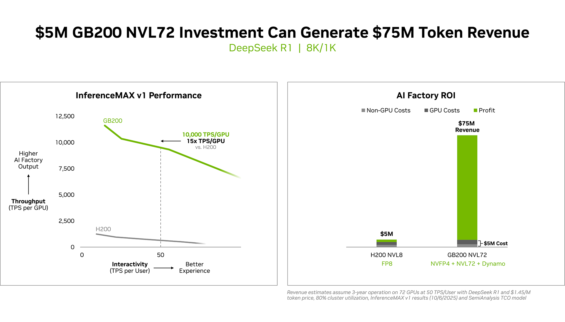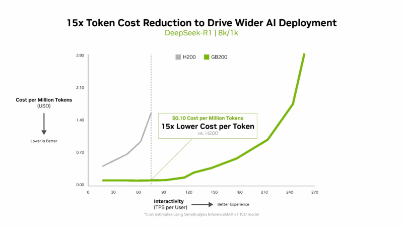 Суперускоритель GB200 NVL72 победил во всех категориях бенчмарка InferenceMAX v1. Чипы NVIDIA Blackwell показали наилучшую окупаемость инвестиций — вложение в размере $5 млн приносят $75 млн дохода от токенов DeepSeek R1, обеспечивая 15-кратную окупаемость (год назад NVIDIA обещала ROI на уровне 700 %). Также ускорители поколения Blackwell отличаются самой низкой совокупной стоимостью владения. например, оптимизация ПО NVIDIA B200 позволила добиться стоимости всего в два цента на миллион токенов на OpenAI gpt-oss-120b, обеспечив пятикратное снижение стоимости одного токена всего за два месяца.