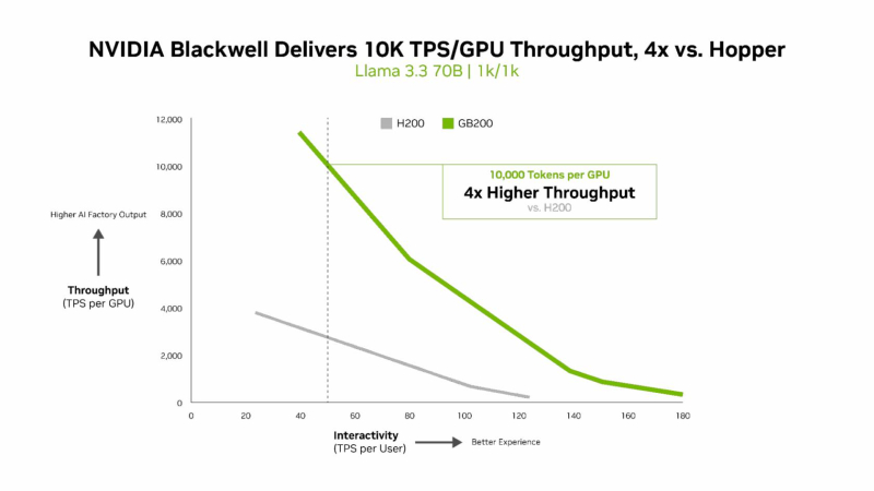 Для моделей с «плотной» архитектурой (Dense AI), таких как Llama 3.3 70b, которые требуют значительных вычислительных ресурсов из-за большого количества параметров и одновременного использования всех параметров в процессе инференса, NVIDIA Blackwell B200 достиг нового рубежа производительности в бенчмарке InferenceMAX v1, отметила NVIDIA. Суперускоритель показал более 10 тыс. токенов/с (TPS) на GPU при 50 TPS на пользователя, т.е. вчетверо более высокую пропускную способность на GPU по сравнению с NVIDIA H200.