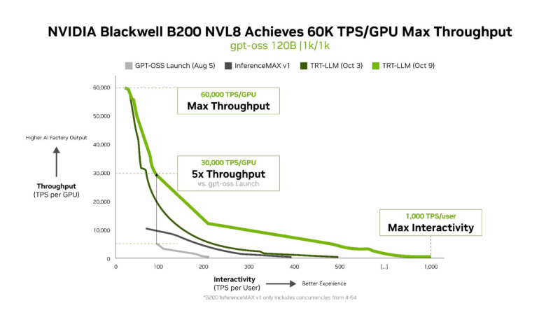 NVIDIA B200 первенствовал и по пропускной способности и интерактивности, обеспечив 60 тыс. токенов в секунду на ускоритель и 1 тыс. токенов в секунду на пользователя в gpt-oss с новейшим стеком NVIDIA TensorRT-LLM. NVIDIA сообщила, что постоянно повышает производительность путём оптимизации аппаратного и программного стека. Первоначальная производительность gpt-oss-120b на системе NVIDIA DGX Blackwell B200 с библиотекой NVIDIA TensorRT LLM уже была лидирующей на рынке, но команды NVIDIA и сообщество разработчиков значительно оптимизировали TensorRT LLM для ускорения исполнения открытых больших языковых моделей (LLM).
