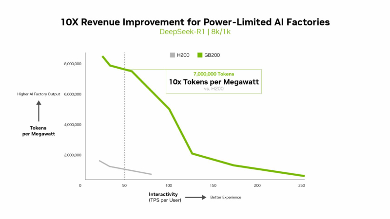 NVIDIA подчеркнула, что такие показатели, как количество токенов на Вт, стоимость на миллион токенов и TPS/пользователь не уступают по важности пропускной способности. Фактически, для ИИ-фабрик с ограниченной мощностью ускорители с архитектурой Blackwell обеспечивают до 10 раз лучшую производительность на МВт по сравнению с предыдущим поколением и позволяют получать более высокий доход от токенов.