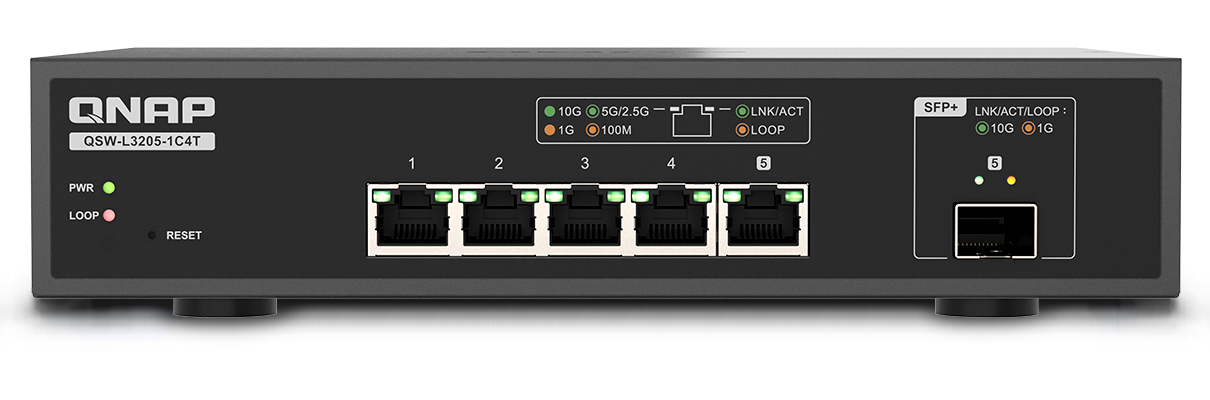 Компания QNAP Systems анонсировала коммутатор QSW-L3205-1C4T в «настольном» форм-факторе, ориентированный на сферу малого бизнеса, небольшие студии, профессиональных создателей контента и пр. Устройство также может использоваться для организации потоковой передачи видео с камер наблюдения.