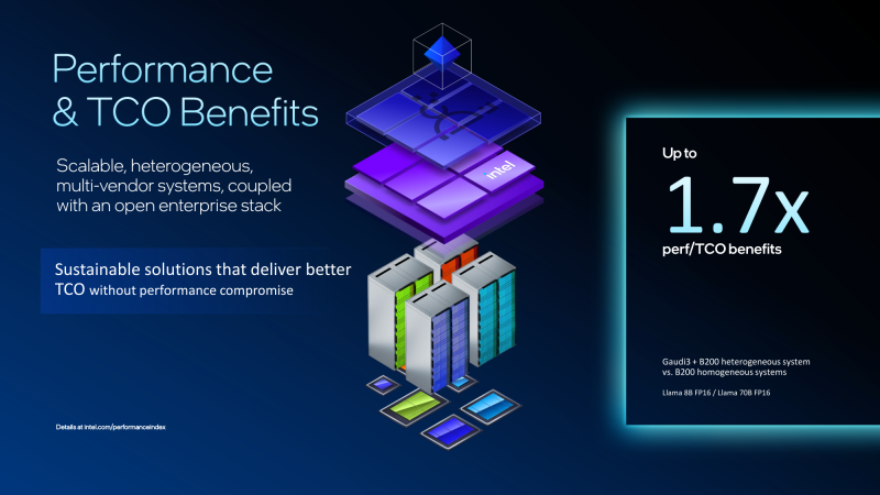 Intel утверждает, что гибридная конфигурация из Gaudi3 и B200 позволяет достичь 1,7-кратного прироста производительности в расчёте на доллар совокупной стоимости владения (TCO) по сравнению с платформами, использующими только B200. Однако, как отмечается, эти заявления пока не подтверждены независимыми тестами. К тому же, программная платформа Gaudi3 отстаёт от платформы NVIDIA и является закрытой. Кроме того, нынешняя архитектура Gaudi приближается к концу своего существования, что ставит под сомнение жизнеспособность предложенной платформы в долгосрочной перспективе.