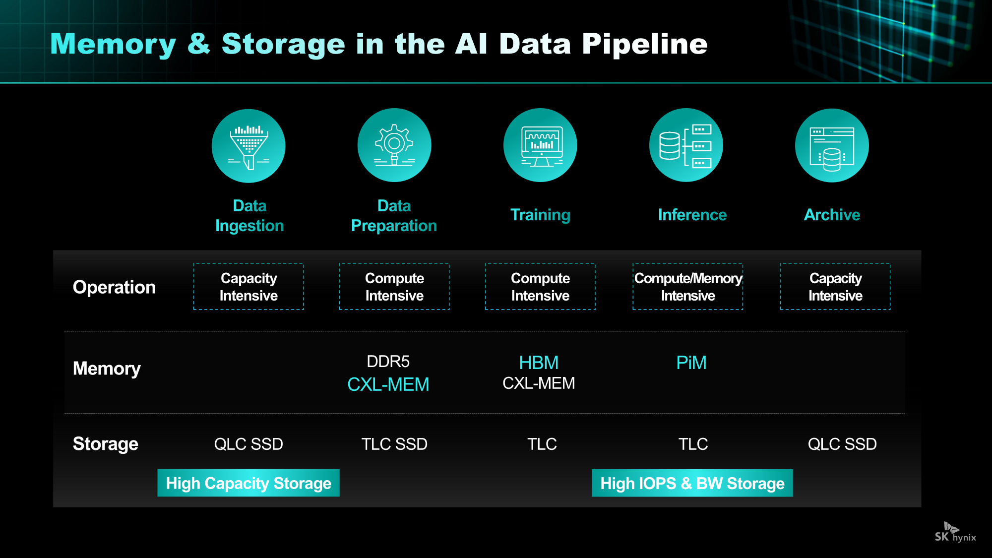 AIN D (Density) — это высокоплотное решение Nearline (NL) SSD для хранения больших объёмов данных с низкими энергопотреблением и стоимостью, подходящее для хранения ИИ-данных. Компания стремится увеличить плотность QLC SSD с Тбайт до Пбайт, создав решение среднего уровня, сочетающее в себе скорость SSD и экономичность HDD. AIN D от SK hynix как раз предназначен для замены жёстких дисков. Компания также упоминает некий стандарт JEDEC-NLF (Near Line Flash?), который пока не существует. При этом SK hynix пока не упоминает PLC NAND и не приводит данные о ёмкости AIN D.
