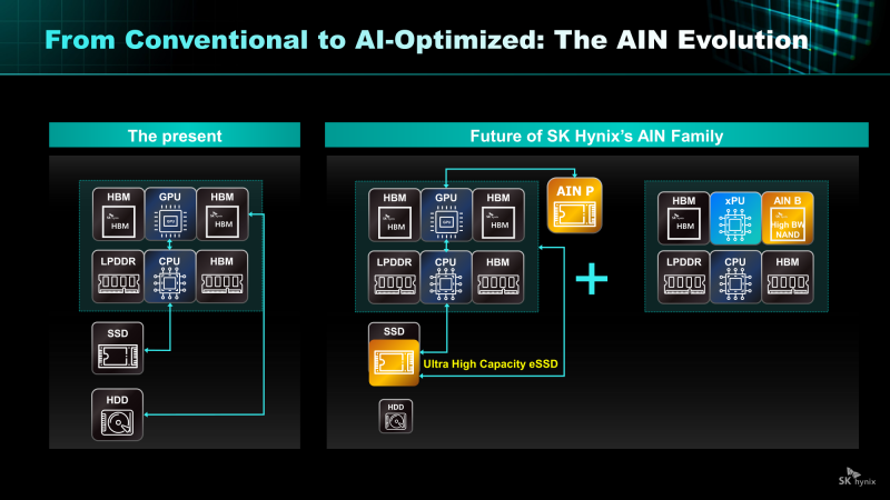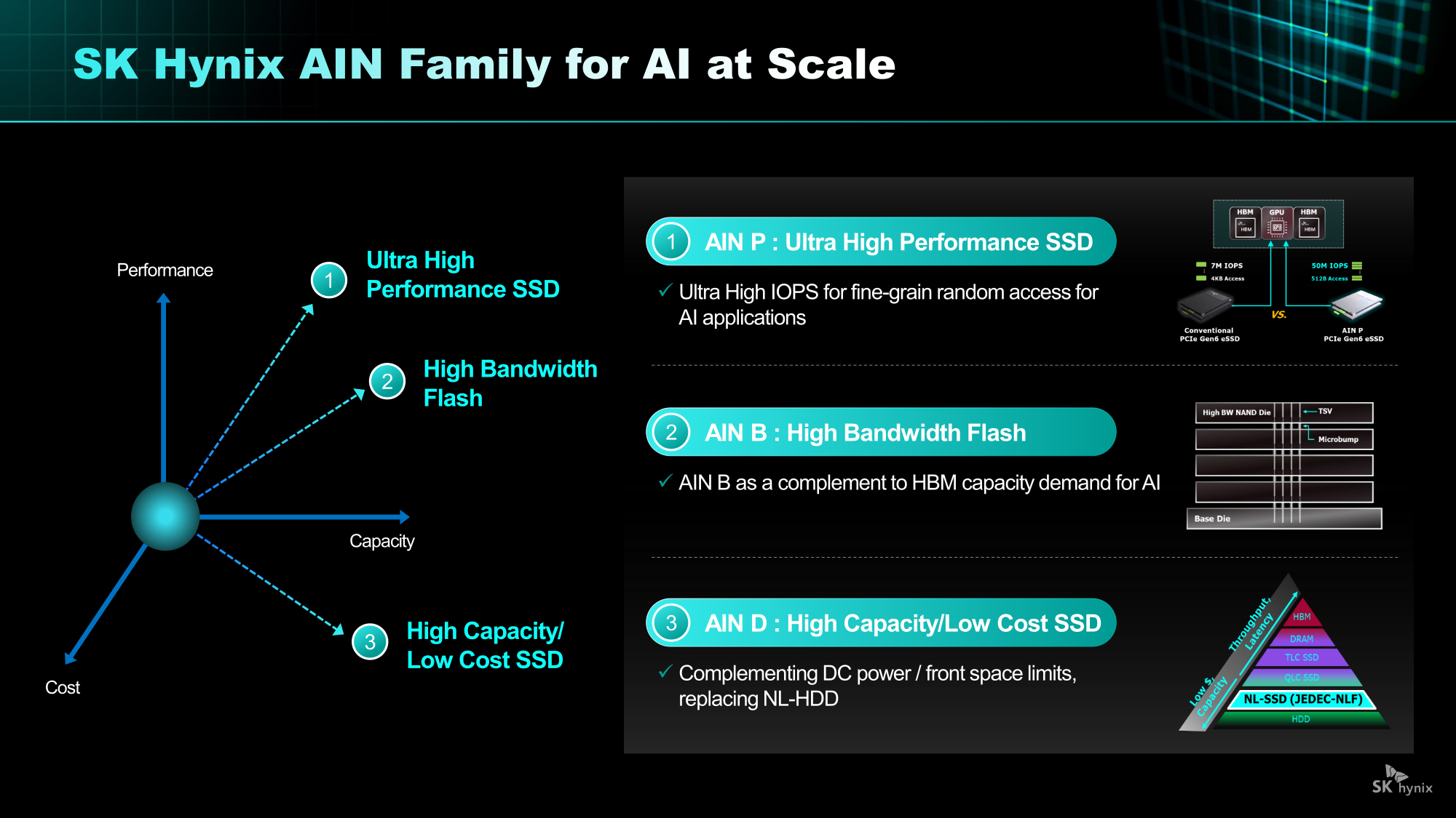 Компания SK hynix представила стратегию развития решений хранения на базе NAND нового поколения. SK hynix заявила, что в связи с быстрым ростом рынка ИИ-инференса спрос на хранилища на базе NAND, способных быстро и эффективно обрабатывать большие объёмы данных, стремительно растёт. Для удовлетворения этого спроса компания разрабатывает серию решений AIN (AI-NAND), оптимизированных для ИИ. Семейство будет включать решения AIN P, AIN B и AIN D, оптимизированные по производительности, пропускной способности и плотности соответственно.