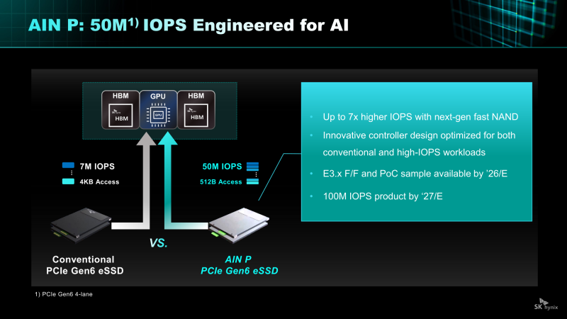 Как пишет Blocks & Files, накопитель AIN P, как ожидается, получит поддержку PCIe 6.0 и обеспечит 50 млн IOPS на 512-байт блоках, тогда как сейчас производительность случайного чтения и записи с 4-Кбайт блоками составляет порядка 7 млн IOPS у накопителей PCIe 6.0. То есть AIN P будет в семь раз быстрее, чем нынешние корпоративные PCIe 6.0 SSD, и, по заявлению SK hynix, достичь 100 млн IOPS можно будет уже в 2027 году. Такой SSD будет выполнен в форм-факторе EDSFF E3.x и оснащён контроллером, предназначенным для выполнения как обычных рабочих нагрузок, так и с высоким показателем IOPS.