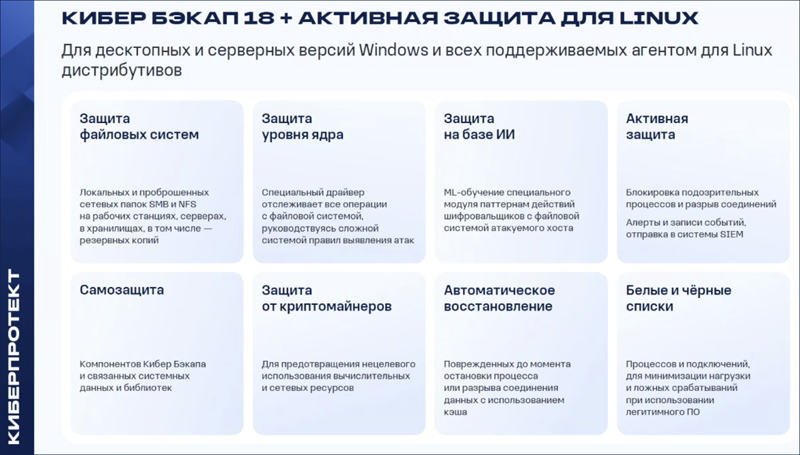 Дополнительно разработчиками была актуализирована поддержка операционных системы семейства Linux — теперь «Кибер Бэкап» поддерживает платформы с версиями ядра вплоть до 6.14. Кроме того, в агент для ОС Linux теперь входит модуль активной защиты от вирусов-шифровальщиков, позволяющий распознавать типичные паттерны действий вредоносного ПО. Модуль агента резервного копирования способен в реальном времени выявлять подозрительные операции, останавливать процессы и разрывать удалённые подключения, а также автоматически восстанавливать повреждённые данные.
