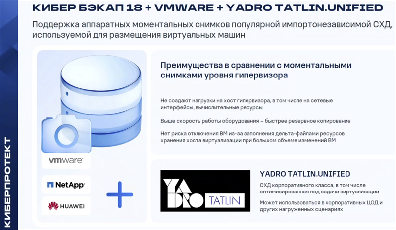 С релизом «Кибер Бэкап» 18.0 список поддерживаемых на уровне гипервизора систем виртуализации пополнился Proxmox VE и платформой на её основе — «Альт Виртуализация». Также появилась поддержка аппаратных моментальных снимков виртуальных машин средствами СХД YADRO TATLIN.UNIFIED в сценарии размещения ВМ под управлением VMware.