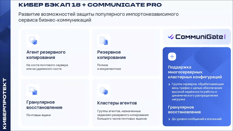 Значительным доработкам подверглись средства интеграции с отечественной платформой CommuniGate Pro — была добавлена поддержка многосерверных кластерных конфигураций для крупных инсталляций коммуникационного сервиса с возможностью гранулярного восстановления — вплоть до уровня почтовых ящиков, сообщений электронной почты и их вложений. Также добавлена защита сервиса Mailion, включая восстановление до уровней почтовых ящиков и отдельных писем в оригинальное расположение.