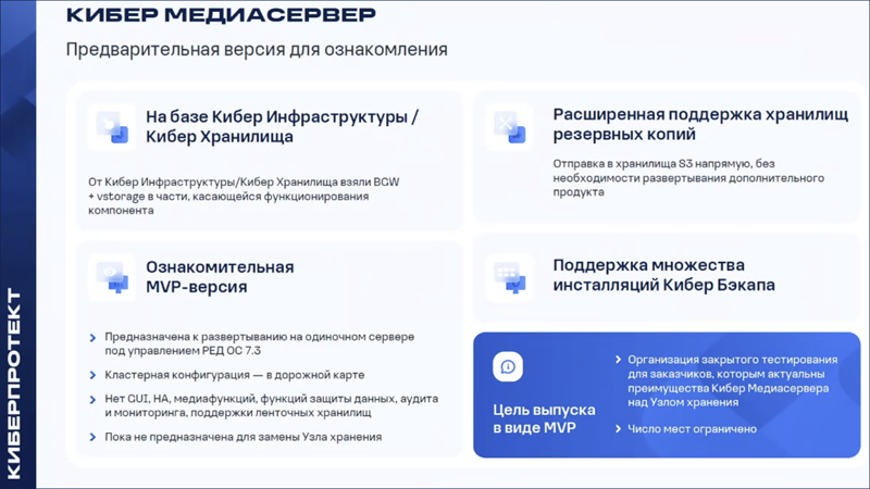 Особенностями «Кибер Медиасервера» являются «прямая» отправка резервных копий в объектные хранилища S3, поддержка Linux-дистрибутива «Ред ОС» 7.3, протоколов SMB/CIFS, NFS, iSCSI, FC и востребованных в корпоративной среде аппаратных и программных хранилищ данных.