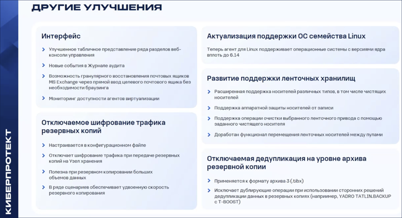 В числе прочего «Кибер Бэкап» 18.0 содержит ряд других важных улучшений, касающихся улучшенной совместимости со сторонними решениями дедупликации резервных копий, возможностей информирования и аудита, управления нагрузкой на вычислительные ресурсы хоста агента при защищённой передаче резервных копий, а также поддержки ленточных хранилищ.
