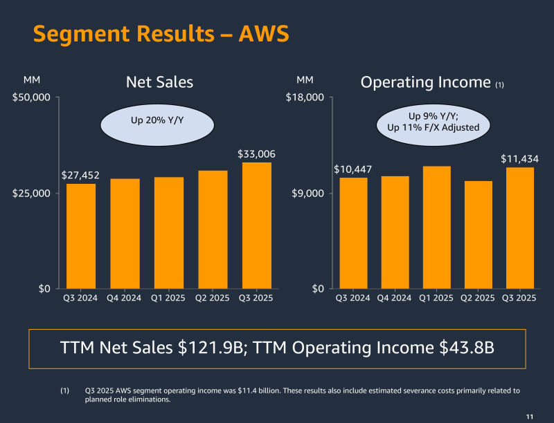 Выручка облачного подразделения Amazon Web Services (AWS) за квартал выросла на 20,2 % до $32,42, превзойдя ожидания аналитиков, опрошенных StreetAccount, в размере $32,42 млрд (рост — 18,1 %). Операционная прибыль сегмента AWS достигла $11,4 млрд по сравнению с $10,4 млрд годом ранее.