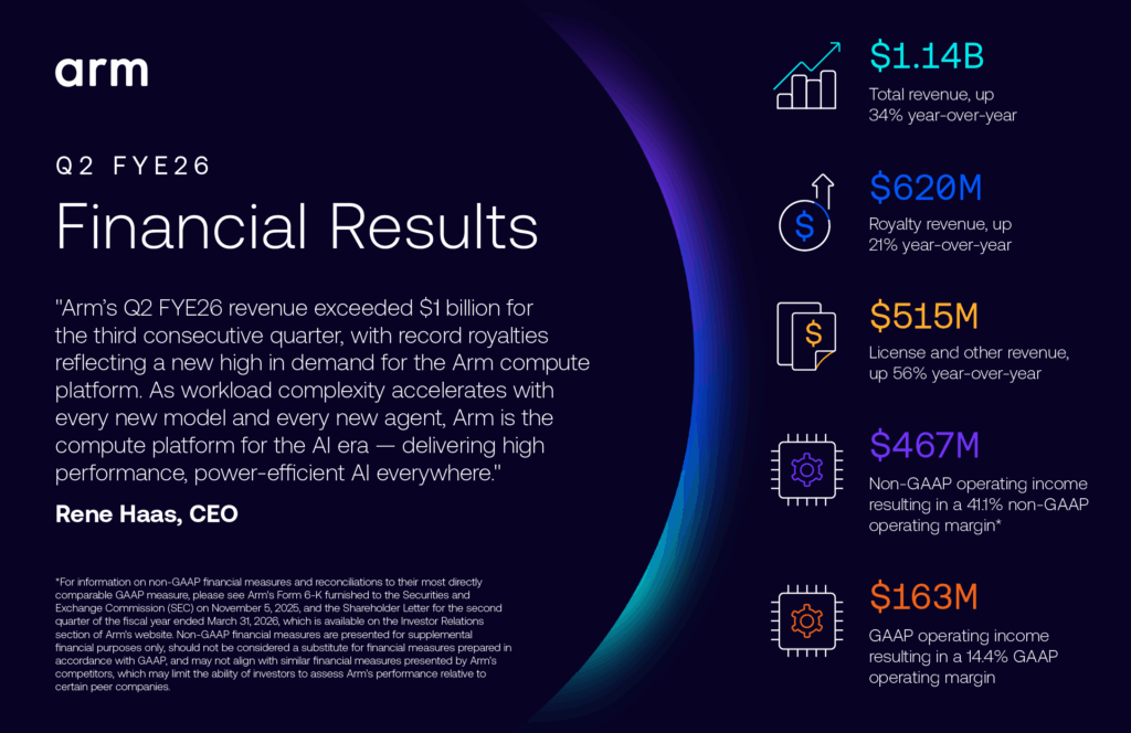 Arm объявила о выручке во II квартале 2026 финансового года в размере $1,14 млрд, что на 34 % больше, чем годом ранее, а также больше прогноза аналитиков в размере $1,06 млрд, пишет Reuters. Третий квартал подряд выручка компании превышает $1 млрд. Выручка компании от роялти выросла год к году на 21 % до рекордных $620 млн, а от лицензирования — на 56 % до $515 млн благодаря новым крупным соглашениям в сфере вычислительных технологий нового поколения. Скорректированная операционная прибыль (Non-GAAP), достигла $467 млн, а скорректированная прибыль на акцию (Non-GAAP), составила $0,39, что в обоих случаях превышает прогноз, отметил ресурс Converge! Network Digest.