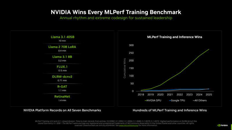 На сегодняшний день NVIDIA является единственной платформой, которая представила результаты MLPerf Training с вычислениями, выполненными с использованием FP4 при соблюдении строгих требований к точности в тесте. Эти результаты были получены с использованием 5120 ускорителей Blackwell GB200, которым потребовалось всего 10 мин. на бенчмарк Llama 3.1 405B, что является новым рекордом. Это в 2,7 раза быстрее, чем лучший результат с использованием архитектуры Blackwell, показанный в предыдущем раунде бенчмарка.