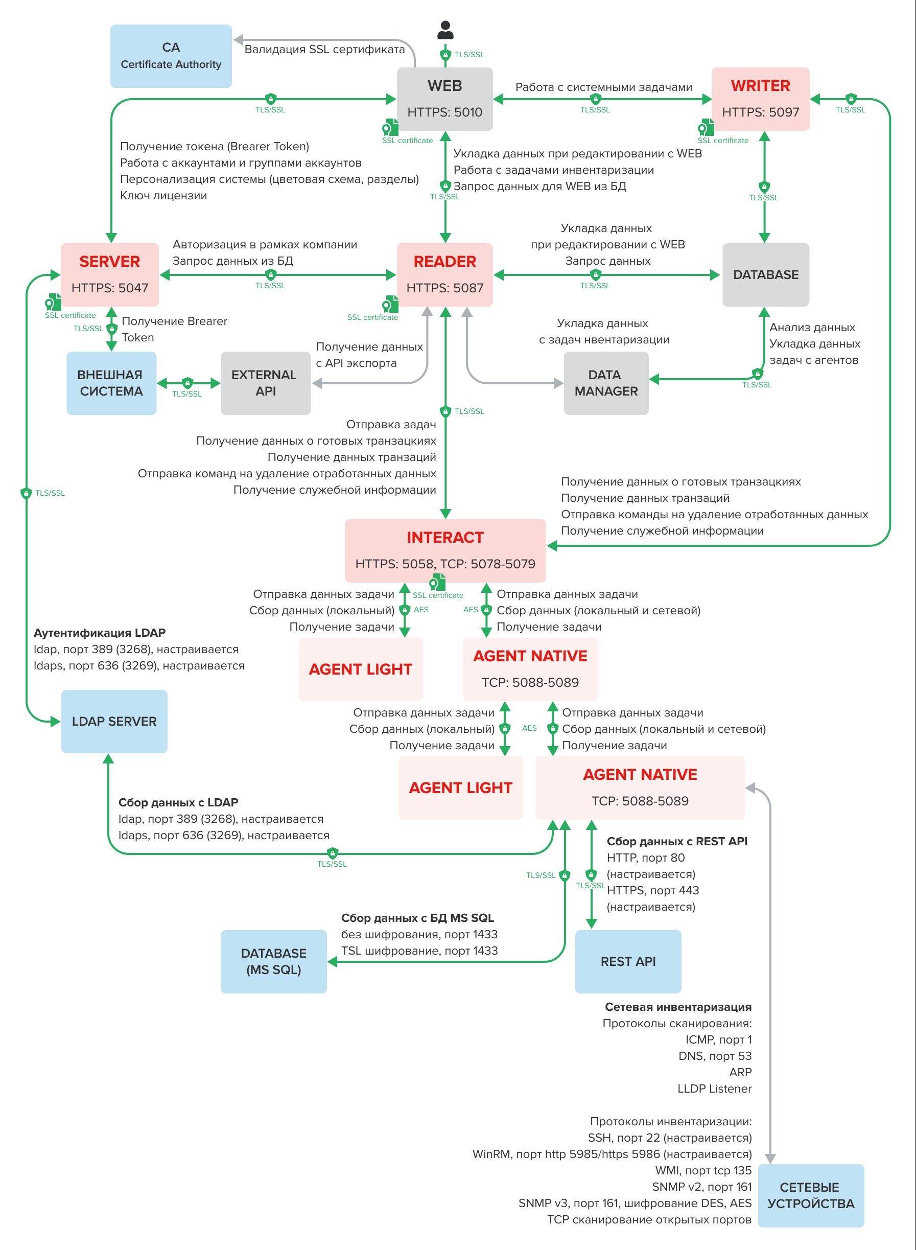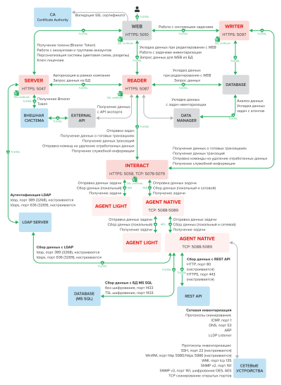 Конечно, «ИТМен» может уведомить и вышестоящий ИБ-инструментарий о появлении (или исчезновении) в обозреваемых системах ПО или «железа», но сделает она это не мгновенно, а постфактум при выгрузке журналов и отчётов. Более того, в изолированных контурах данные вообще могут переноситься не так уж часто, пересекая «воздушный зазор» на физических носителях, т. е. даже вне прямой области видимости. То же касается и, например, геораспределённых сетей. При этом в любом случае собираемые данные шифруются, в том числе по ГОСТ’у, есть возможность принести собственные сертификаты и, что самое главное, настроить работу с данными в соответствии с внутренними политиками безопасности. Непосредственно сама платформа интегрируется с LDAP, а также позволяет создавать группы и пользователей с различными правами и задавать им парольные политики. В будущих релизах обещана более гранулярная выдача прав.