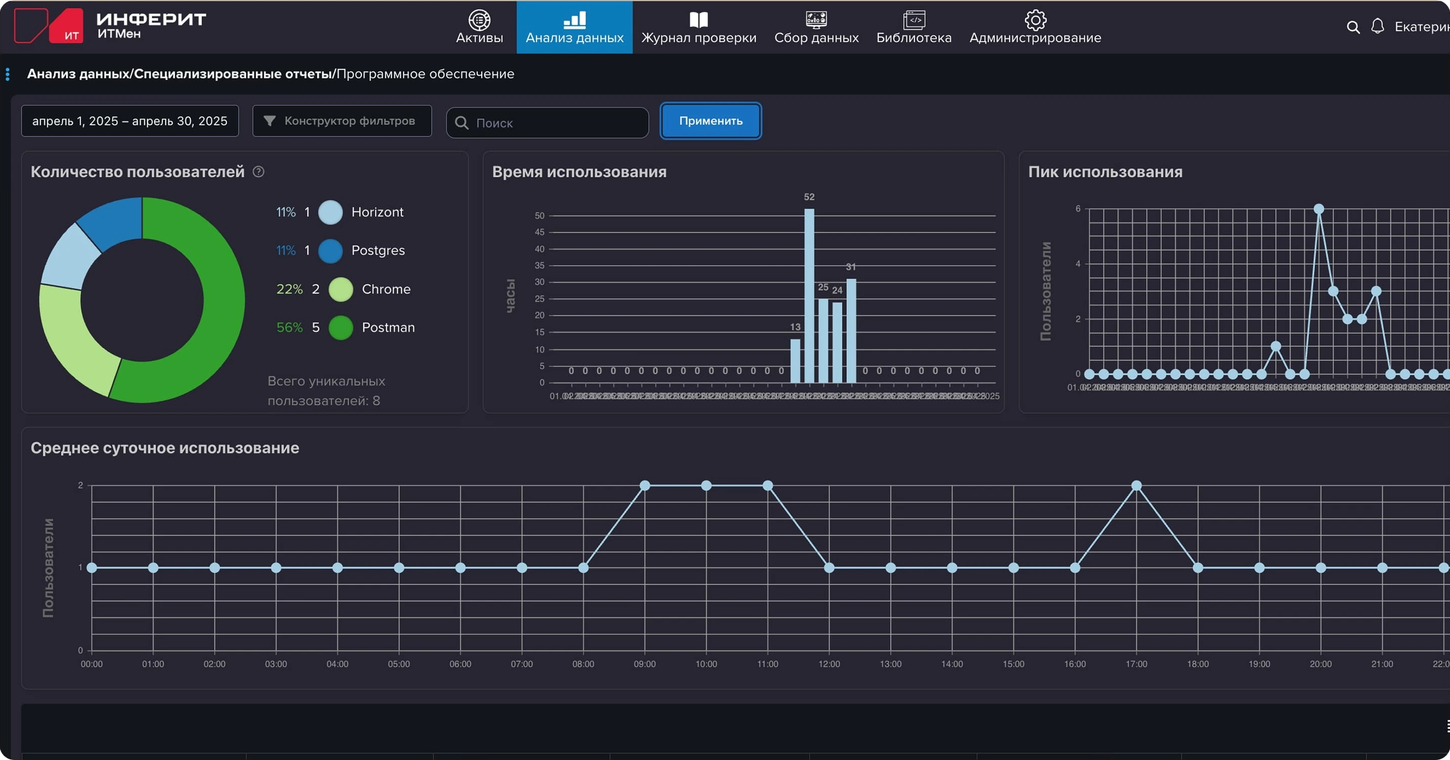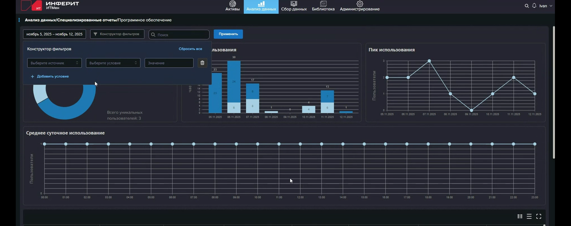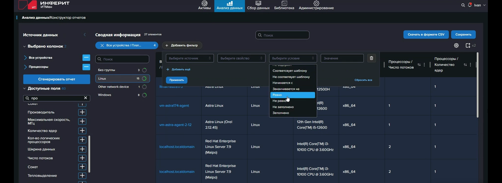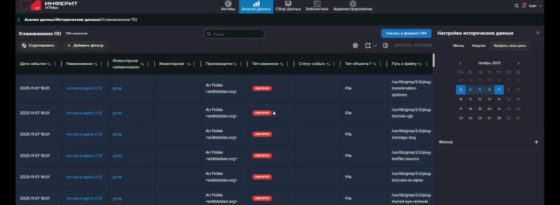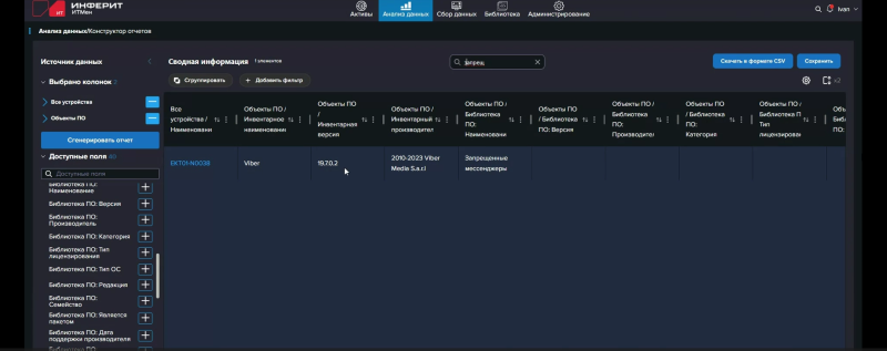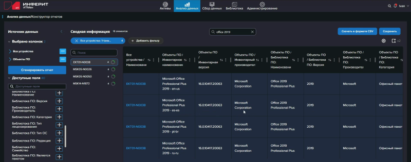 Активы можно сгруппировать и отфильтровать по тому или иному параметру. Например, собрать воедино все устройства с Windows или определённого производителя. Для более глубокого и регулярного анализа предназначен раздел «Анализ данных». В нем находится конструктор отчётов, позволяющий создавать необходимые подборки, сохранять их в виде своих отчётов и настраивать регулярную отправку на определённую почту. Раздел «Исторические данные» позволяет отследить изменения в исторических данных в заданные даты. Например, можно составить отчёт об установке/удалении того или иного приложения, а для самих устройств можно отследить изменения того или иного параметра. В специальном отчёте «Использование ПО» можно отслеживать длительность и частоту использования приложений и их уникальных пользователей, что полезно при наличии конкурентных лицензий на ПО (для этого можно даже построить наглядные графики). Отчёты имеют табличный формат с настраиваемым отображением столбцов. Внутри отчётов доступны группировка, фильтрация и сортировка. Для отчётов доступна регулярная отправка на почту.