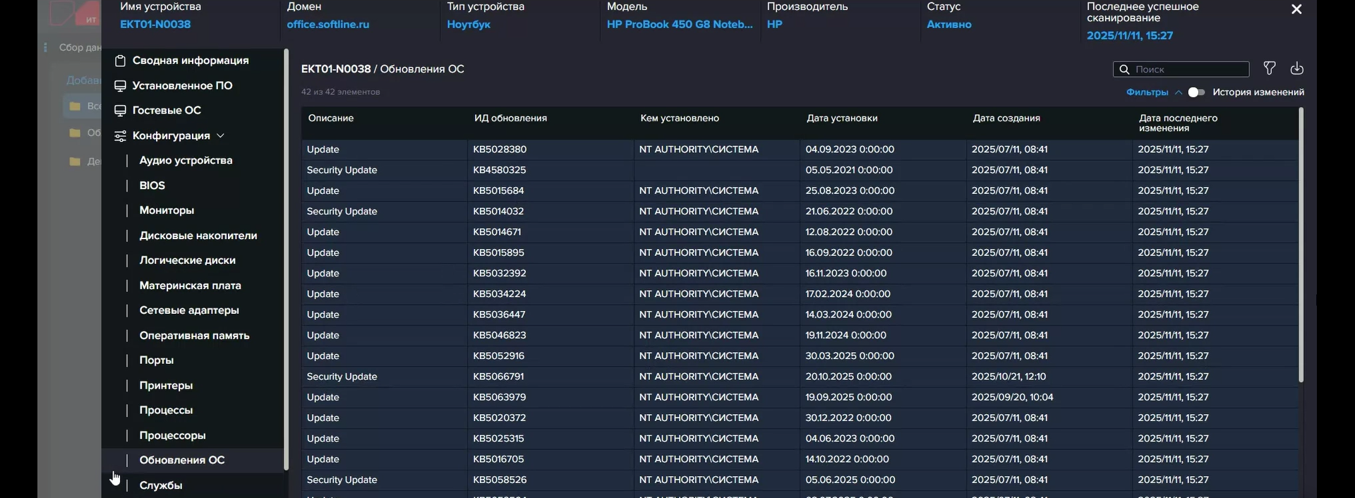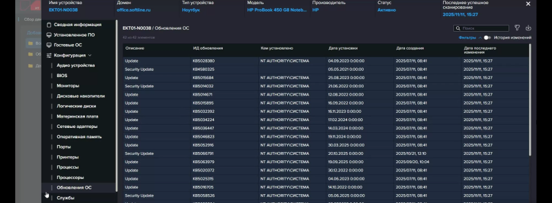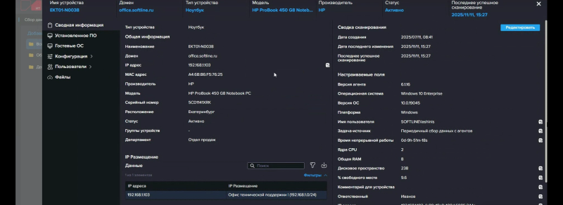 Все найденные и вручную добавленные устройства отображаются в специальном разделе, где их можно сгруппировать вручную или по какому-либо свойству, в том числе «раскидать» их по департаментам или филиалам с формированием вложенных подгрупп. У каждого устройства есть системные и настраиваемые поля, для заполнения некоторых из них нужны справочники. Некоторые поля или атрибуты можно заполнить в процессе обогащения данных, но об этом чуть позже. Для каждого устройства формируется карточка, где приведены все собранные о нём данные. В случае ПК/серверов/ВМ это полная аппаратная конфигурация, логические тома, гостевые ОС, сведения о пользователях и последнем входе, список установленного ПО и т. д. А, например, у принтера это будет «пробег» и объём тонера. Но, как и говорилось выше, собирать можно практически всё, что угодно.