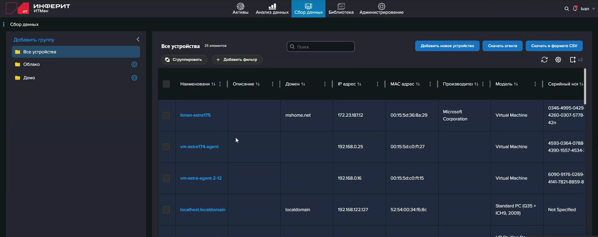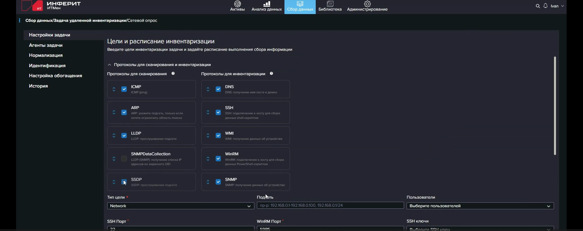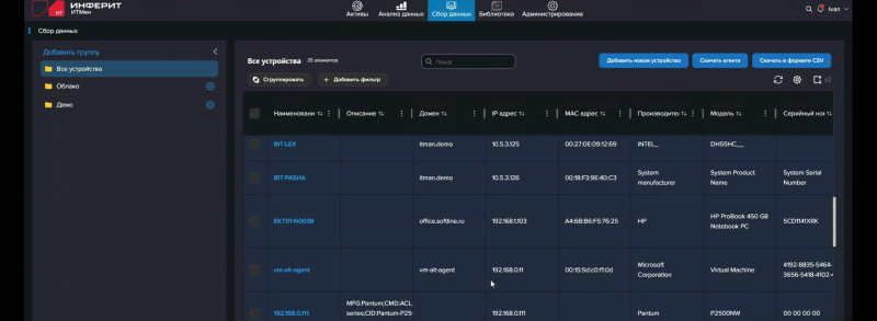 Для дискаверинга и инвентаризации по сети используются протоколы ICMP, ARP, LLDP, SNMP (v1, v2, v3), SSDP, DNS, SSH, WinRM, WMI и IPMI. Для последних четырёх, очевидно, нужно иметь удалённый доступ к хостам. Методы аутентификации поддерживаются самые разнообразные. Агенты «знают» все эти протоколы, а возможность их использования ограничена только поддержкой и доступностью нужного протокола со стороны удалённого хоста. Проще говоря, «ИТМен» изначально поддерживает работу в гибридных окружениях. Первичные данные об устройствах организации можно получить и из Active Directory (а также Samba, FreeIPA и LDAP вообще) или SCCM, а потом регулярно обновлять данные оттуда или же полагаться на сетевой дискаверинг. Но данные можно также собирать посредством SQL-запросов (Microsoft SQL и PostgreSQL) и REST API. Последнее, например, позволяет удобно работать с VMware-хостами. Да-да, «ИТМен» умеет работать и с гипервизорами, и с виртуальными машинами, и с контейнерами.