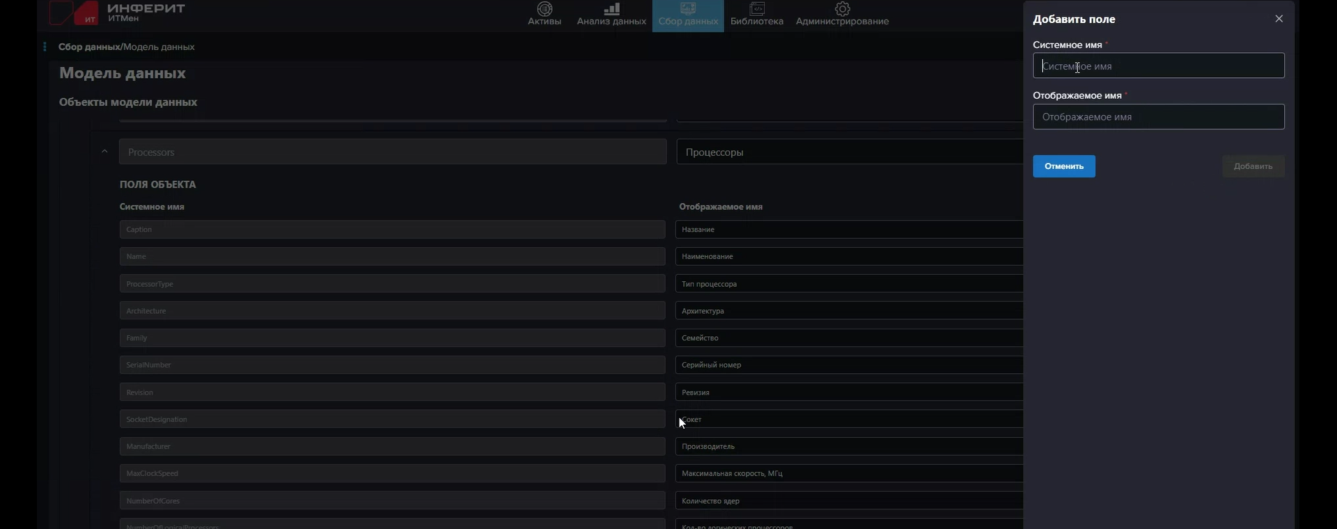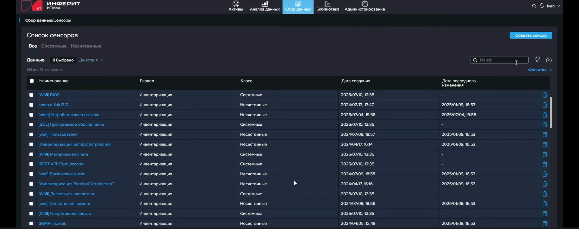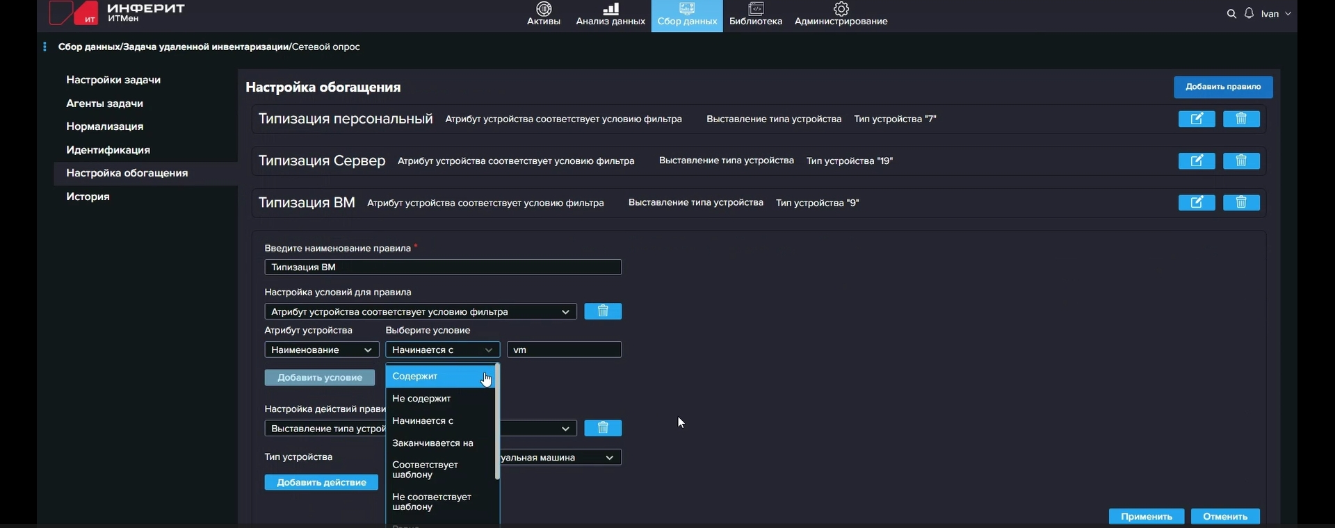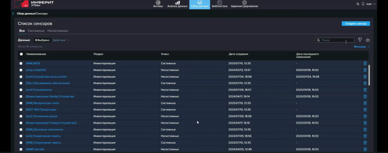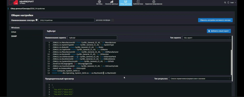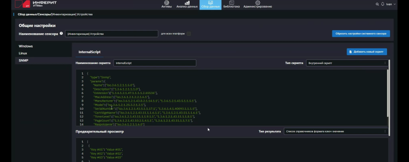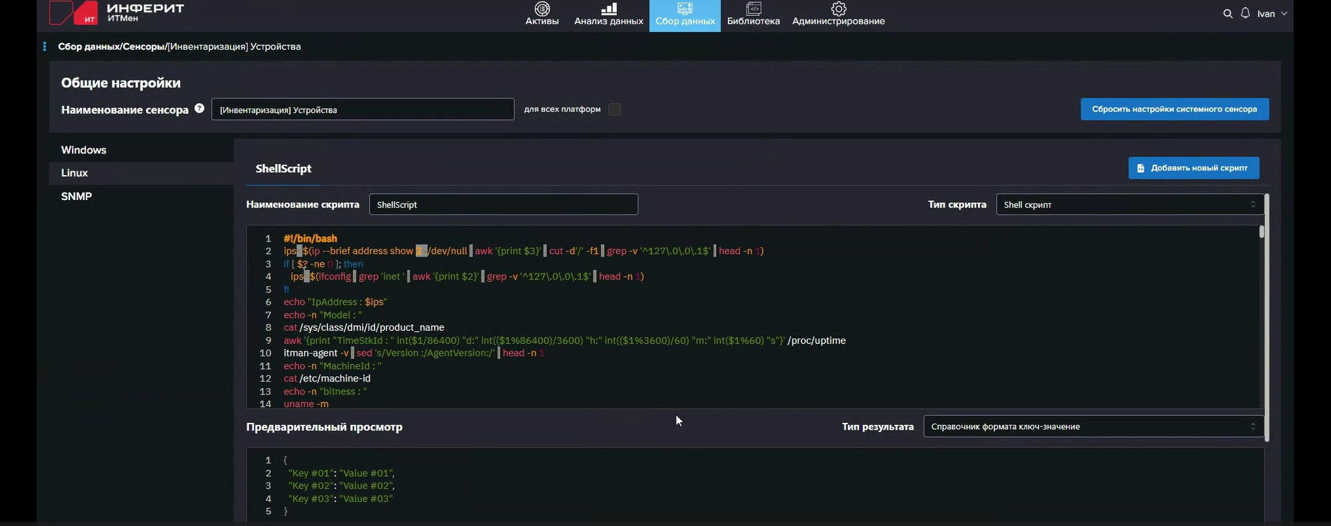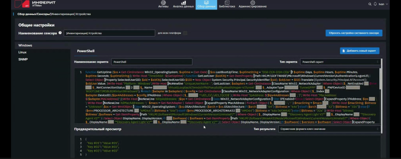 За сбор данных отвечают т.н. сенсоры, исполняемые агентами. Сенсоры — это фактически скрипты: PowerShell, Shell, SQL или внутренний скрипт «ИТМен». В одном сенсоре может содержаться несколько скриптов, например для последовательного сбора (или добора) данных или для выполнения разных скриптов в зависимости от заданных условий (И/ИЛИ). Условиями могут быть, к примеру, (не)успешное (не)выполнение предыдущего скрипта с (не)получением данных от него, тип ОС (Windows/Linux), наличие в собранных данных какого-то конкретного значения поля (атрибута) одного из объектов (активов): устройств, ПО, пользователей. «ИТМен» предлагает динамическую модель данных, так что для собираемой сенсорами информации можно создавать собственные поля различных типов, а не полагаться только на встроенные, которые, впрочем, покрывают самые часто используемые типы собираемых данных.