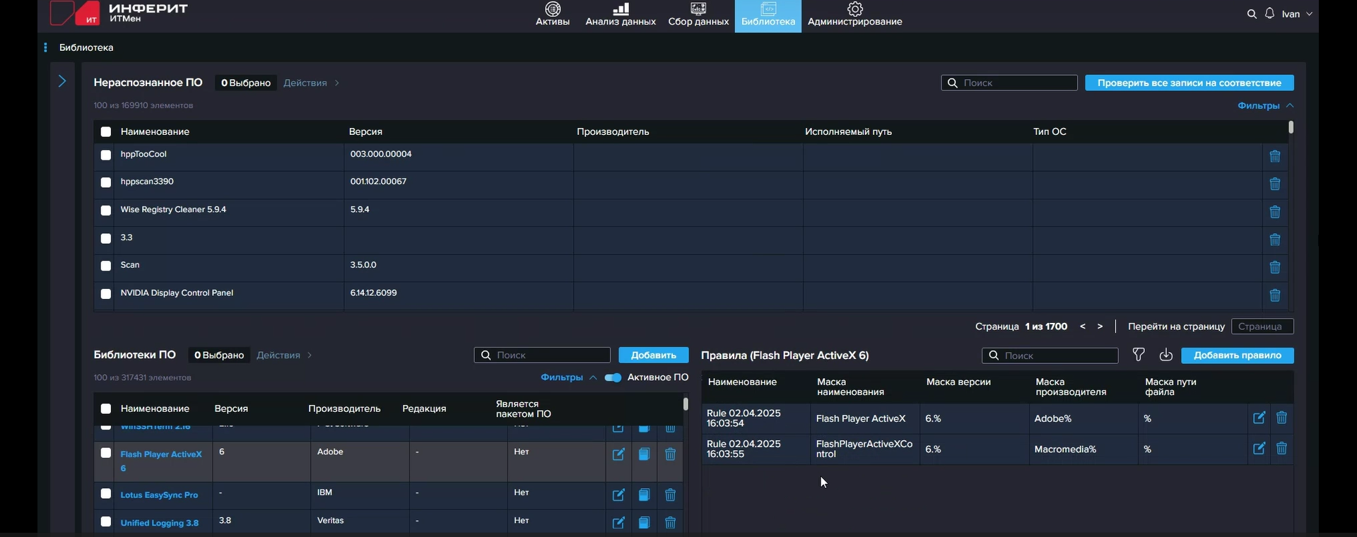 Активы — устройства, ПО, пользователи — представлены в одноимённом разделе. Именно сюда после инвентаризации попадают все собранные и обработанные сведения, с которыми можно работать в дальнейшем. Для ПО есть ещё одна крайне полезная функция — нормализация и идентификация данных с помощью каталога ПО, где есть сведения о более чем 315 тыс. приложений и служб. Библиотеку ПО (справочник) можно, конечно, наполнять и вручную, если разнообразие приложений не так велико. Но с готовым каталогом намного удобнее. Вообще работа с ПО в «ИТМен» достаточно продумана. Так, например, установка нескольких языковых версий Microsoft Office засчитывается как одна установка. Также помимо сбора установленного ПО предусмотрена инвентаризация исполняемых файлов на устройствах, позволяющая получать дополнительную информацию (версия, описание и путь к исполняемому файлу). И в целом ведётся учёт количества установок. Отдельно формируется список нераспознанного ПО, о котором нет сведений в библиотеке. Более того, «ИТМен» может отслеживать любое запущенное ПО, так что portable-версии тоже не ускользнут от его ока. Также можно задать списки запрещённого и разрешённого для использования на устройствах ПО. Наконец, для пользователей ведётся учёт, на каких устройствах и когда они входили.