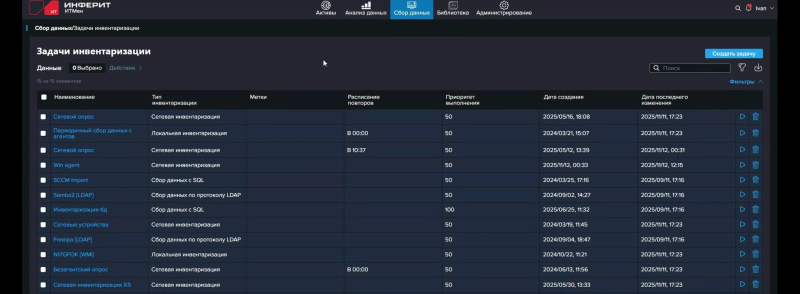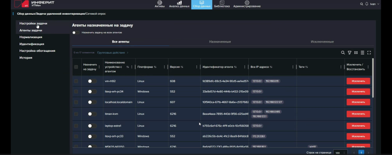 Непосредственно процесс инвентаризации заключается в формировании задач с их последующим запуском в соответствии с выставленным приоритетом, вручную или с заданной регулярностью/по расписанию. Для каждой задачи выбираются нужные агенты, у каждого из которых видно наименование устройства, на котором он установлен. Агентам для удобства поиска и выбора можно присвоить теги, в том числе при первичной установке. Затем отбираются сенсоры, которые и предоставят данные. Для этих сведений доступна нормализация по справочнику. Например, Microsoft и Microsoft Corp. будут записаны как просто Microsoft, если в справочнике для этого вендора уже заведены различные варианты написания его имени. Поскольку какие-то получаемые данные могут совпадать у нескольких объектов, например одинаковое имя устройств в разных доменах или в разных сетях, либо, наоборот, одно устройство было обнаружено одновременно, скажем, во время сетевой инвентаризации и при опросе службы каталога, на следующем шаге настраивается идентификация, т. е. такое сочетание нескольких полей, которое будет определять уникальность объекта.