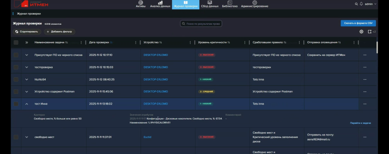 Ещё одна важная функция — журналы проверки для регулярного отслеживания выбранных полей (атрибутов) устройств. Для этого используются наборы правил, где каждое правило проверяет соответствие выбранного поля заданному критерию. Дополнительно задаётся уровень критичности: низкий, средний, высокий. На основе одного или нескольких правил формируются задачи проверки, которые исполняются с заданной регулярностью, а затем отправляют результаты на email. При этом можно настроить их так, что при отсутствии изменений отчёт отправляться лишний раз не будет. Всё отчёты складываются в журналы проверки, где с ними можно ознакомиться и потом. Также есть отдельные задачи оповещения, которые будут отслеживать изменения определённых конфигураций устройств и отправлять уведомления на почту или по REST API.