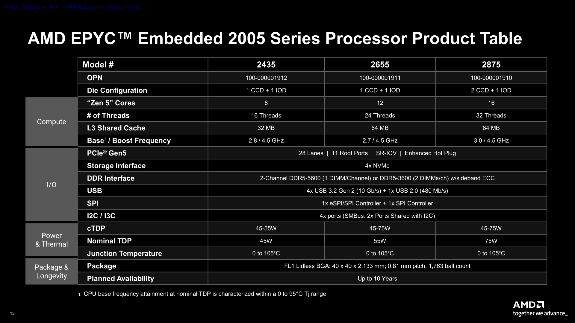 AMD выпустит три чипа EPYC Embedded 2005, которые станут доступны в I вартале 2026 года: 2435, 2655 и 2875 с 8, 12 и 16 ядрами Zen 5 (все с SMT) и TDP в размере 45, 55 и 75 Вт соответственно. Модели EPYC Embedded 2875 и EPYC Embedded 2655 имеют кеш-память L3 объёмом 64 Мбайт, а EPYC Embedded 2435 — 32 Мбайт. Поддерживается точная настройка профилей тепловыделения и энергопотребления.