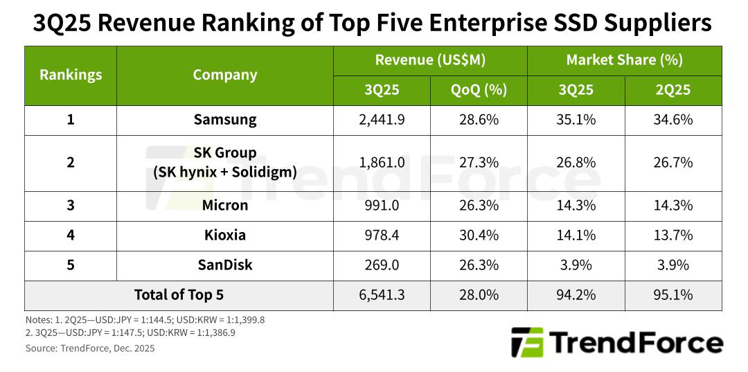 Лидером отрасли является компания Samsung, которая выигрывает от широкого ассортимента устройств на основе чипов памяти TLC. В III четверти 2025 года продажи южнокорейского поставщика поднялись на 28,6 % по сравнению с предыдущим кварталом, достигнув приблизительно $2,44 млрд. При этом доля Samsung составила 35,1 %. На втором месте в рейтинге располагается SK Group (SK hynix и Solidigm), у которой выручка в квартальном исчислении выросла на 27,3 % — до $1,86 млрд, а доля зафиксирована в размере 26,8 %.