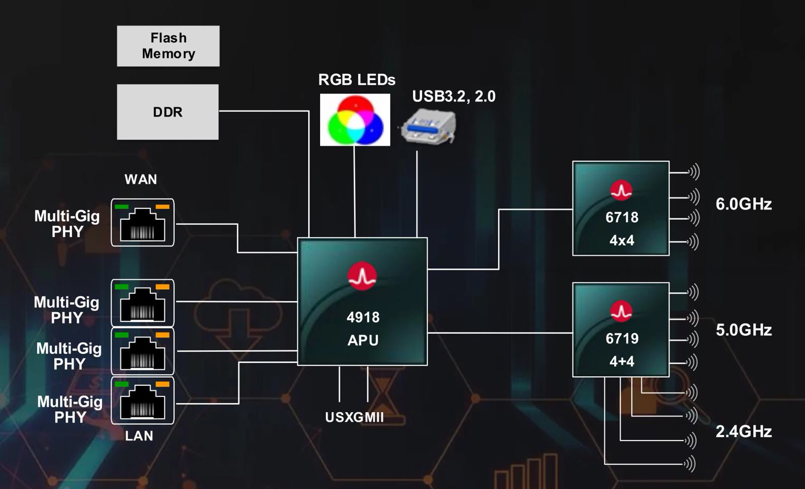 Чипы имеют разную конфигурацию антенн: 4 × 4 для 2,4 ГГц и 4 × 4 для 5 ГГц у BCM6719 и 3 × 3 для 2,4 ГГц и 4 × 4 для 5 ГГц у BCM6714. В обоих случаях реализован аппаратный телеметрический движок, который в режиме реального времени собирает информацию о состоянии сети: эти данные затем могут быть использованы ИИ-моделью на периферии для повышения качества обслуживания, улучшения безопасности и снижения эксплуатационных расходов.