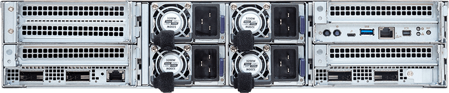 Сервер имеет габариты 438 × 87 × 900 мм и массу 42,8 кг. За питание отвечают четыре блока мощностью 3200 Вт с сертификатом 80 PLUS Titanium. Диапазон рабочих температур простирается от +10 до +35 °C.