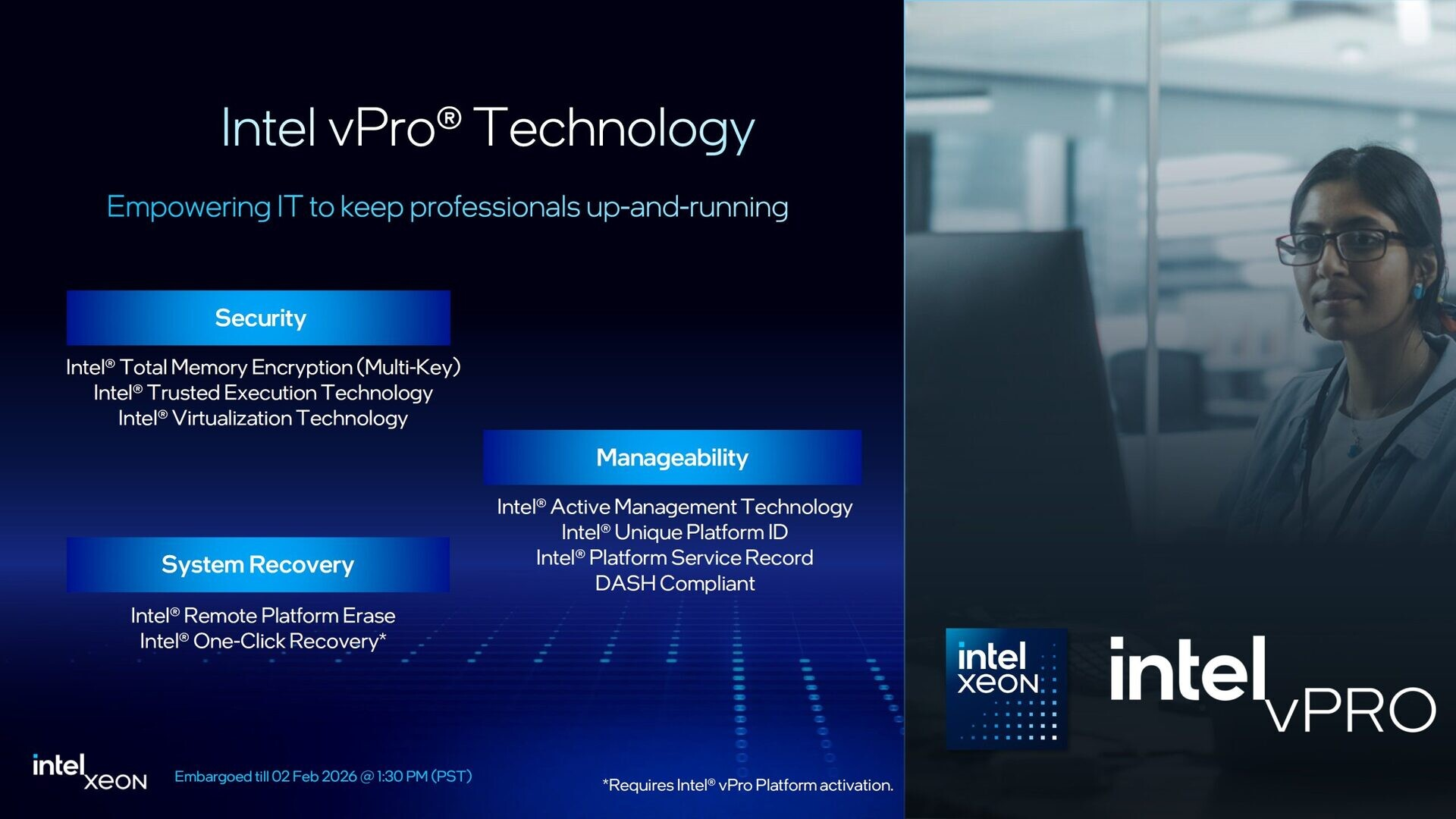 По заявлениям Intel, по сравнению с процессорами для рабочих станций предыдущего поколения прирост производительности в однопоточном режиме у Xeon 600 составляет до 9 %, в многопоточном режиме — до 61 %. Улучшения затронули встроенный аппаратный ускоритель Intel AMX (Advanced Matrix Extensions), предназначенный для повышения производительности в задачах ИИ, глубокого обучения и анализа данных. Если ранее он поддерживал операции INT8 и BFloat16, то теперь добавлен режим FP16. Среди прочего упомянуты технологии Intel vPro Enterprise и Intel Deep Learning Boost.