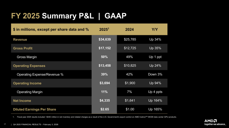 AMD сообщила о рекордной выручке за весь 2025 год в размере $34,64 млрд (рост 34 %), валовой марже в 50 % (рост 1 п.п.), операционной прибыли в $3,69 млрд (рост 94 %), чистой прибыли в $4,34 млрд (рост — 164 %) и прибыли на разводнённую акцию в $2,65 (рост — 165 %).