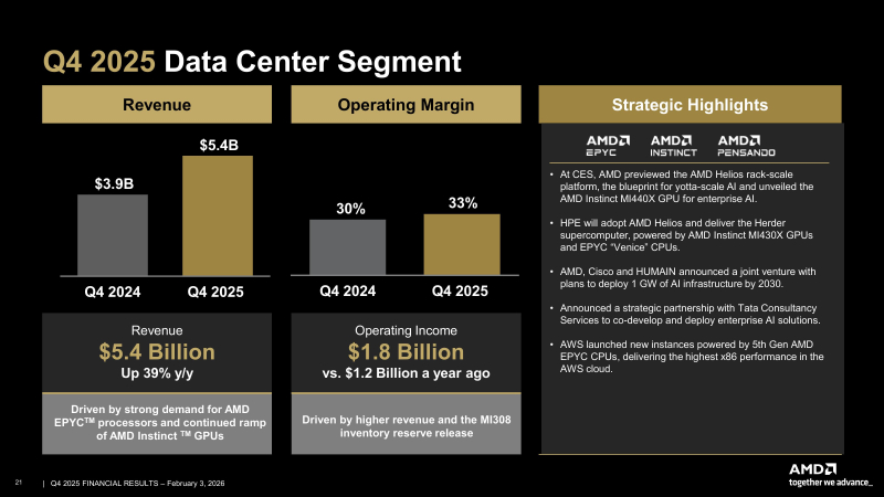 Подразделение ЦОД AMD, которое поставляет CPU и ИИ-ускорители, принесло рекордную выручку в $5,38 млрд (рост — 39 %), что выше прогноза аналитиков в $4,97 млрд (по данным finance.yahoo.com) благодаря высокому спросу на процессоры AMD EPYC и продолжающемуся наращиванию поставок ускорителей AMD Instinct. Операционная прибыль подразделения составила $1,75 млрд, что значительно выше показателя годом ранее в размере $1,07 млрд. За весь 2025 год выручка сегмента ЦОД достигла рекордных $16,6 млрд, что на 32 % больше, чем годом ранее.