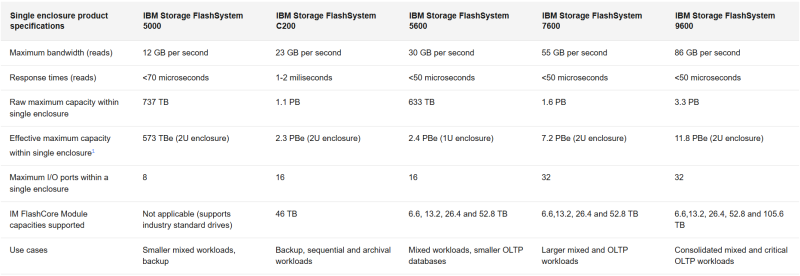 IBM FlashSystem 9600 создана для критически важных операций, требующих экстремальной производительности и максимальной масштабируемости, обеспечивает до 11,8 Пбайт эффективной ёмкости в одной системе форм-фактора 2U, до 86 Гбайт/с и до 6,3 млн IOPS. Количество портов — до 32. Узлы включают два 48-ядерных AMD EPYC и 1,5 или 3 Тбайт RAM. Типичные сценарии использования системы включают основные банковские системы, ERP-платформы и приложения на основе ИИ, требующие скорости и расширенной безопасности. По данным компании, использование FlashSystem 9600 позволяет снизить эксплуатационные расходы на 57 % за счёт ИИ и консолидации по сравнению с предыдущим поколением.