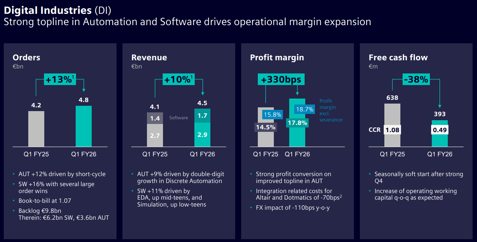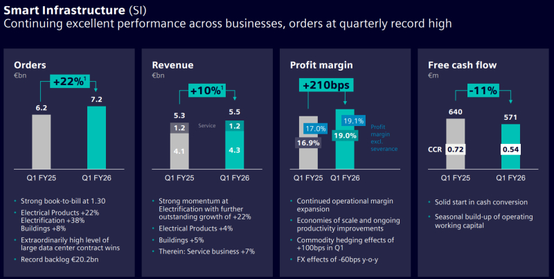 Увеличение выручки Siemens связывает с бумом ИИ, который спровоцировал расширение глобальной инфраструктуры дата-центров. В подразделении промышленных решений Siemens Digital Industries квартальная выручка поднялась на 12 % — с €4,05 млрд до €4,53 млрд, тогда как объём заказов увеличился с €4,21 млрд до €4,85 млрд, то есть, на 15 %. В сегменте умных инфраструктур Siemens Smart Infrastructure продажи выросли на 5 % — с €5,29 млрд до €5,53 млрд, а объём заказов прибавил 16 %, достигнув €7,17 млрд против €6,20 млрд годом ранее. В целом, индустриальный бизнес Siemens в I квартале 2026 финансового года обеспечил прибыль в размере €2,90 млрд против €2,52 млрд годом ранее.