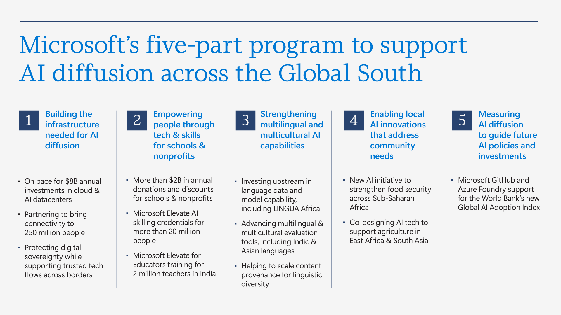 Инфраструктура жизненно необходима для распространения ИИ, говорит компания. ИИ требует энергии, каналов связи, вычислительных мощностей. Только в последнем финансовом году Microsoft инвестировала более $8 млрд в инфраструктуру ЦОД, обслуживающую Глобальный Юг, включая Индию, Мексику, страны Африки, Южной Америки, Юго-Восточной Азии и Ближнего Востока. В первую очередь компания стремится расширить доступ в интернет 250 млн человек в макрорегионе. Microsoft заявила, что уже помогла получить доступ в интернет 117 млн человек в Африке.