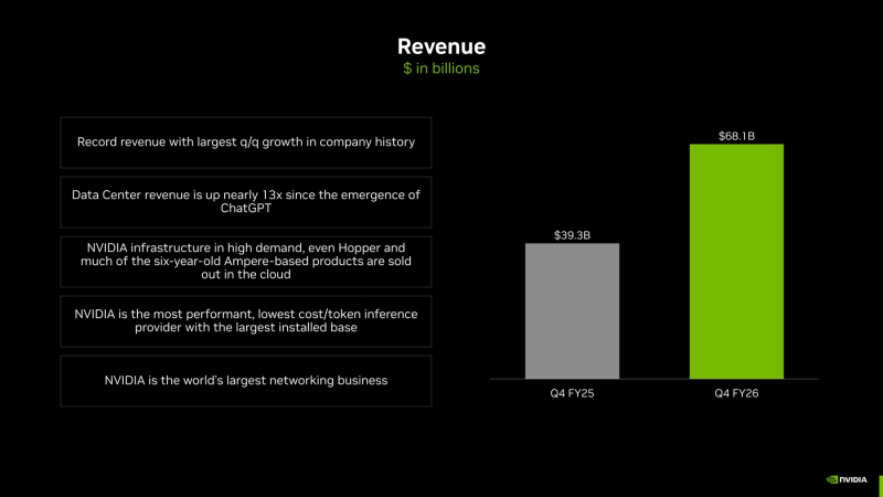 NVIDIA опубликовала отчёт о финансовых результатах за IV квартал и 2026 финансовый год, закончившийся 25 января 2026 года. Результаты компании превзошли ожидания Уолл-стрит. Общая выручка NVIDIA за IV финансовый квартал составила $68,13 млрд, что на 20 % больше, чем в III квартале, и на 73 % больше, чем годом ранее, превысив прогноз аналитиков, опрошенных LSEG, в размере $66,21 млрд (по данным CNBC). Скорректированная чистая прибыль на разводнённую акцию (Non-GAAP) составила $1,62 при прогнозе от LSEG в размере $1,53. Чистая прибыль (GAAP) составила $42,96 млрд или $1,76 на разводнённую акцию, тогда как годом ранее эти показатели равнялись $22,09 млрд и $0,89 соответственно.