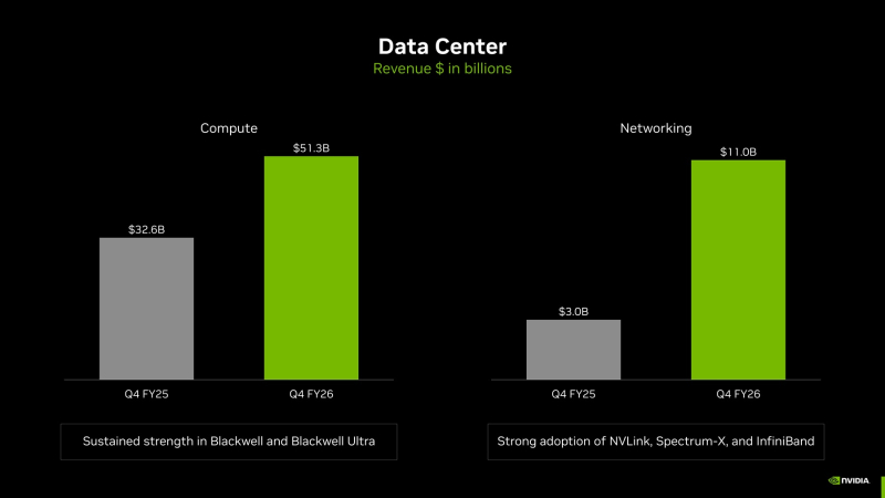 Более 91 % продаж компании приходится на сегмент решений для ЦОД, выручка которого составила $62,3 млрд, что на 75 % больше год к году, а также превысило ожидания аналитиков в $60,69 млрд, согласно данным StreetAccount. В этом сегменте выручка от поставки решений для вычислений выросла на 58 % год к году до $51,33 млрд, а выручка от продаж сетевого оборудования увеличилась за квартал на 263 % до $10,98 млрд. Финансовый директор Колетт Кресс (Colette Kress) объяснила быстрый рост бизнеса «продолжающимся наращиванием вычислительной инфраструктуры NVLink для систем GB200 и GB300, а также развитием платформ Ethernet и InfiniBand».