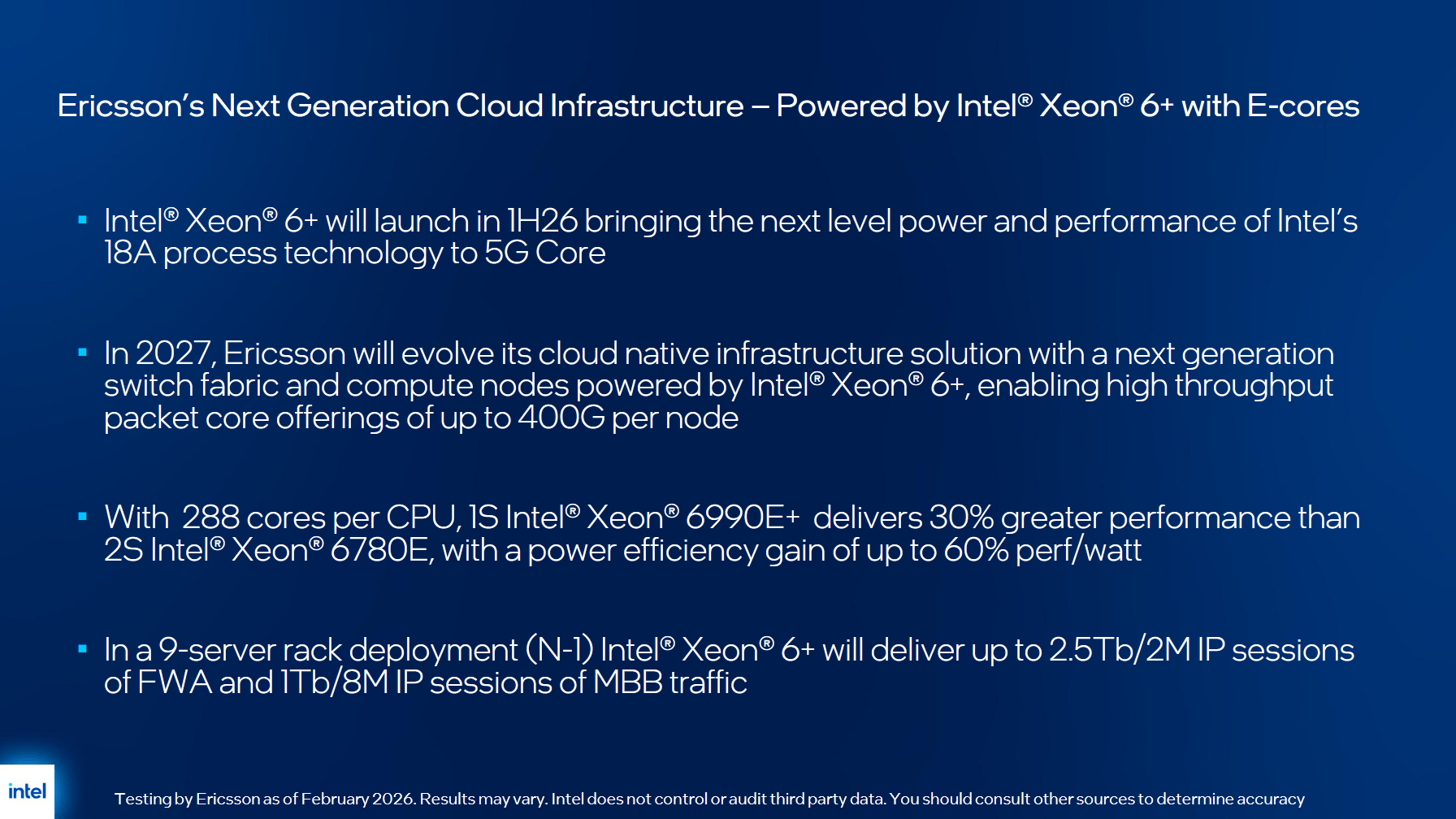 Выход серверных процессоров Xeon 6+ запланирован на I половину 2026 года, подтвердила директор Intel по продуктам Xeon Кира Бойко (Kira Boyko) изданию ComputerBase. Но до их широкого внедрения могут пройти месяцы — Ericsson планирует начать использовать новые процессоры Xeon в 2027 году.