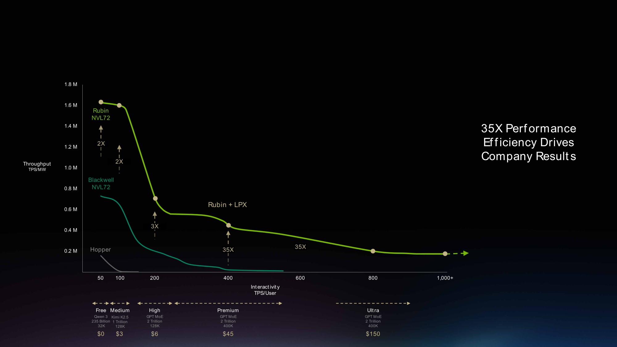 Для обработки новых рабочих нагрузок требуется инфраструктура, способная обеспечить как высокую пропускную способность инференса, так и низкую задержку. Объединение Vera Rubin NVL72 с Groq 3 LPX как раз и формирует гетерогенную архитектуру, сочетающую производительность крупномасштабной ИИ-фабрики с быстрой генерацией токенов. Vera Rubin NVL72 с Groq 3 LPX обеспечивают более высокую пропускную способность при более высоких уровнях интерактивности — в 35 раз быстрее по сравнению с системами Grace Blackwell NVL72 при 400 TPS на пользователя.