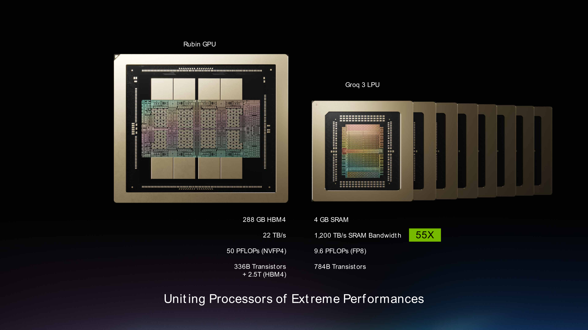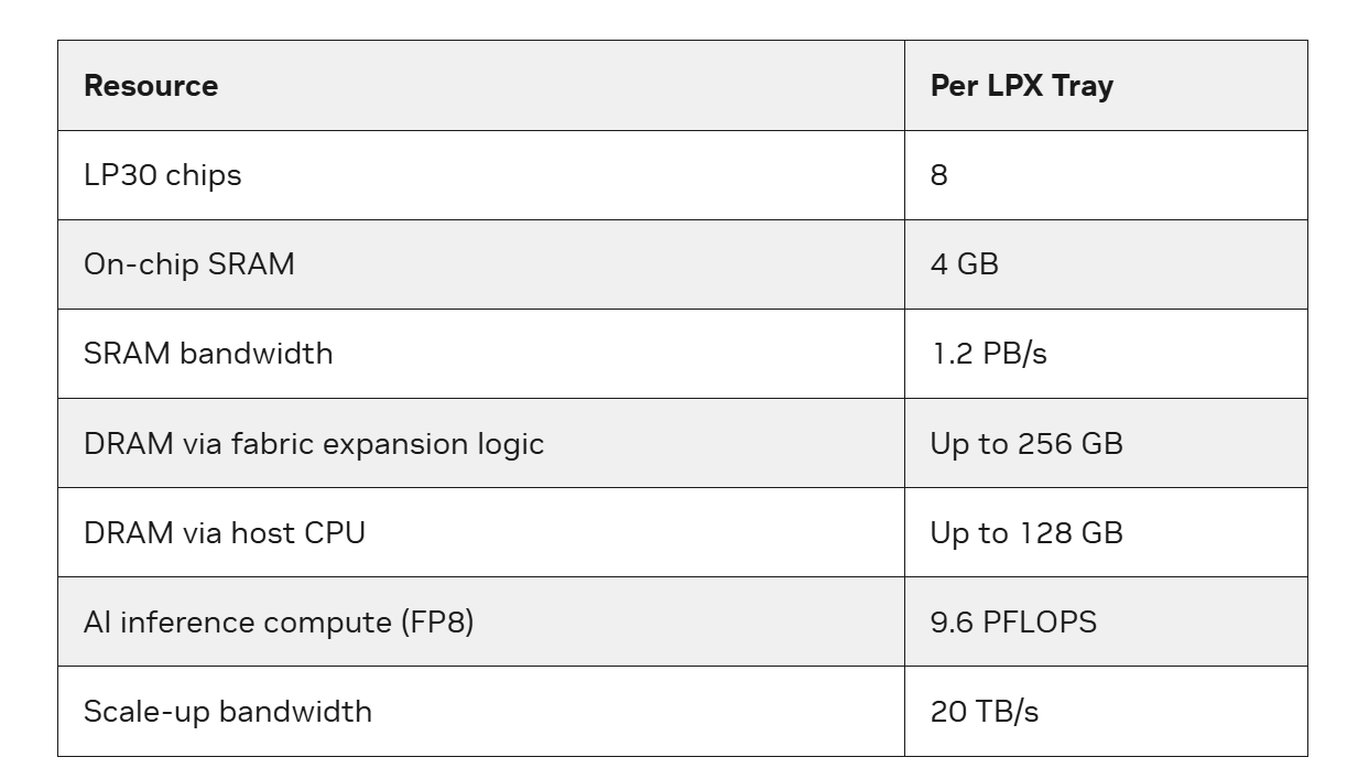 - Матричный модуль (MXM) обеспечивают возможность плотного умножения и накопления для тензорных операций, работающих с фиксированными типами данных с предсказуемой пропускной способностью. Каждый из 8 чипов Groq 3 LP30 обеспечивает до 1,2 Пфлопс (FP8), что в сумме даёт до 9,6 Пфлопс (FP8) на один узел LPX или до 315 Пфлопс (согласно спецификациям NVIDIA) на стойку.