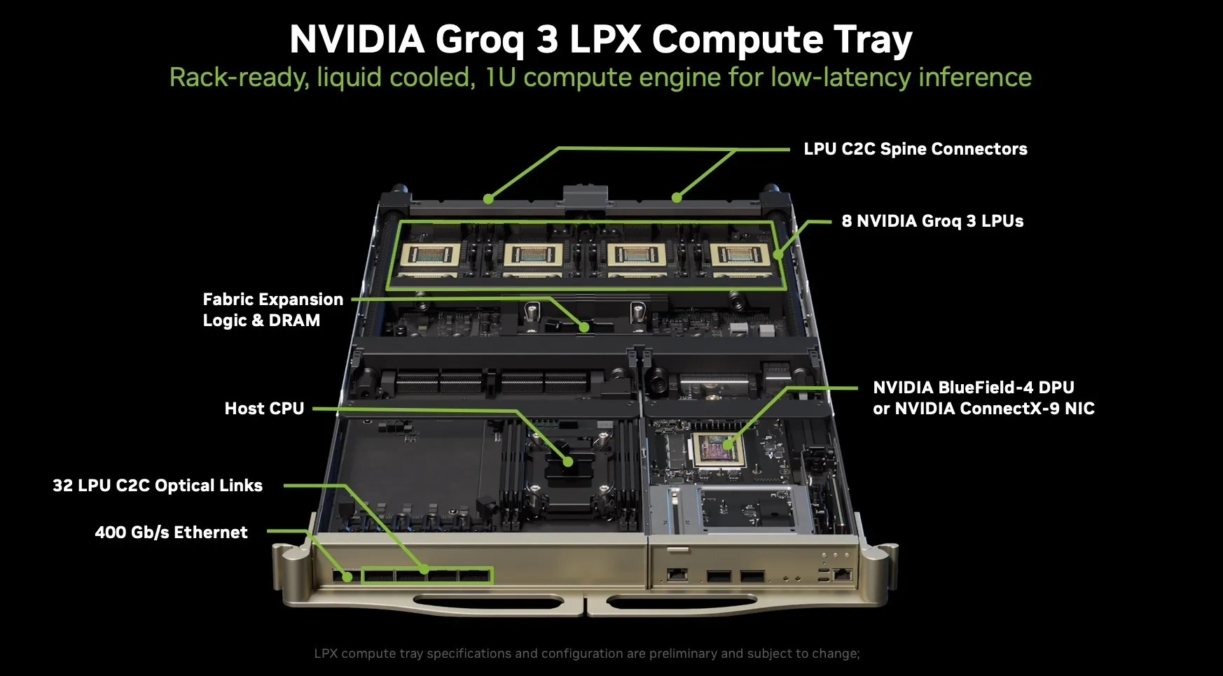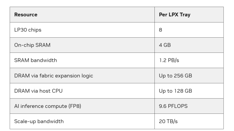 160-КВт стоечный суперускоритель NVIDIA Groq 3 LPX содержит 256 ИИ-чипов Groq 3 (LP30) с 96 млрд транзисторов в каждом — 32 узла высотой 1U с СЖО, объединяющих по восемь ускорителей LPU, x86 CPU, до 128 Гбайт RAM (возможно расширение до ещё плюс 256 Гбайт) и сетевые компоненты в бескабельной конструкции MGX, что упрощает развёртывание в стойке и обеспечивает тесную связь между вычислениями и коммуникацией. С2С-интерконнект RealScale обеспечивают прямую связь LPU внутри узла, между узлами и между стойками. На системном уровне LPX создан для использования в режимах инференса, где затраты на координацию и джиттер могут быстро стать заметными для пользователей.