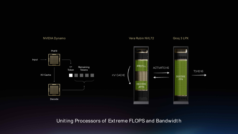 Система LPX обеспечивает ИИ-фабрику движком, оптимизированным для быстрой и предсказуемой генерации токенов, в то время как Vera Rubin NVL72 выступает в роли гибкого универсального инструмента для обучения и инференса, обеспечивая высокую пропускную способность на этапах предварительного заполнения и декодирования, включая обработку длинного контекста, работу механизма внимания и обслуживание систем с высокой степенью параллелизма в масштабе.