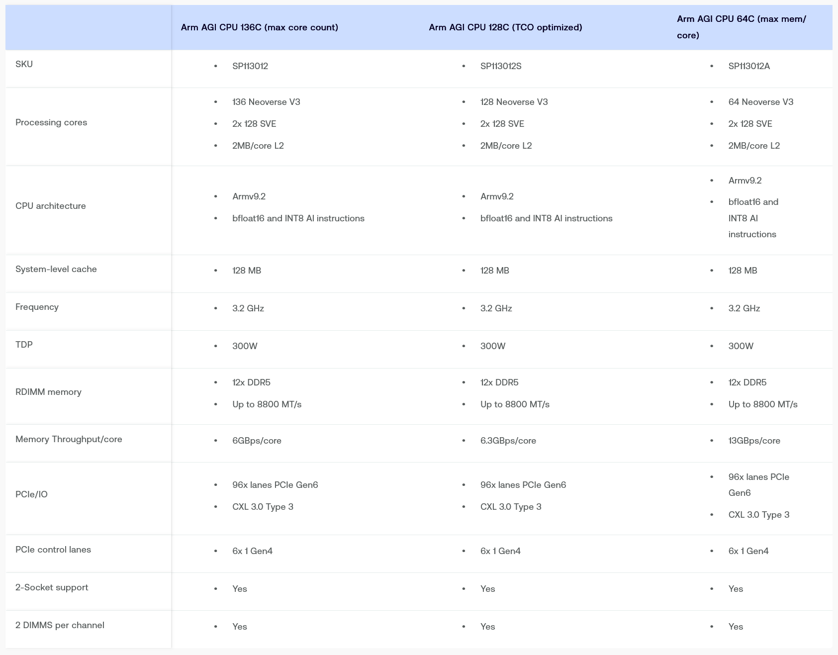 Флагманский процессор AGI от Arm — это чип SP113012 с 136 ядрами Neoverse V3 (Poseidon), работающими на частоте до 3,7 ГГц (базовая частота 3,2 ГГц), распределёнными между двумя чиплетами, изготовленными по 3-нм техпроцессу TSMC. Каждое ядро содержит два 128-бит SVE-блока для векторных вычислений. Заявлена поддержка инструкций MMLA и форматов BF16/INT8. Процессор имеет 2 Мбайт L2-кеша на ядро, а также 128 Мбайт общего системного кэша (SLC). Чип предлагает 96 линий PCIe 6.0 с CXL 3.0 (Type). Пропускная способность памяти составляет 6 Гбайт/с на ядро при целевой задержке менее 100 нс. Всего доступно 12 каналов DDR5-8800 (2DPC).