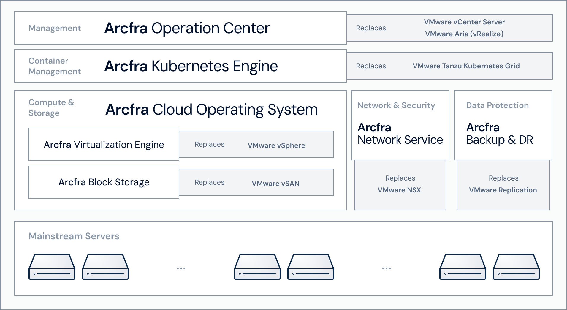 AECP построено на облачной операционной системе Arcfra (ACOS) с модульными компонентами, такими как Arcfra Virtualization Engine (AVE), Arcfra Network Storage (ABS) и Arcfra Kubernetes Engine. AECP версии 6.3 обеспечивает более 11 млн IOPS, более 130 ГиБ/с и задержку менее 100 мкс на кластере из трёх узлов. По словам компании, платформа позволяет снизить общую стоимость владения (TCO) более чем на 50 % по сравнению с решением VMware VCF.