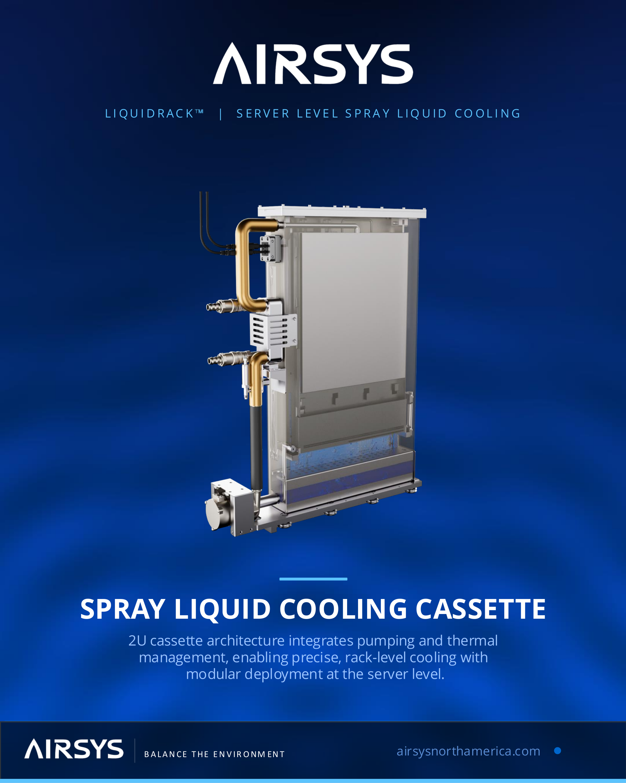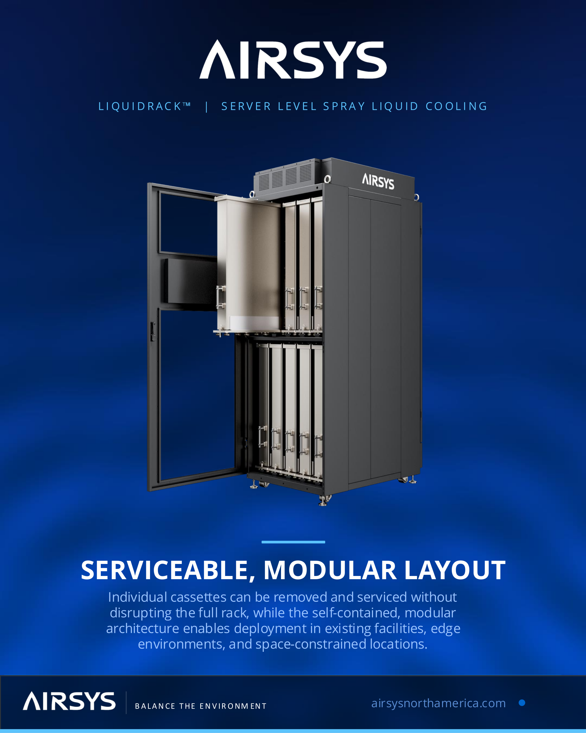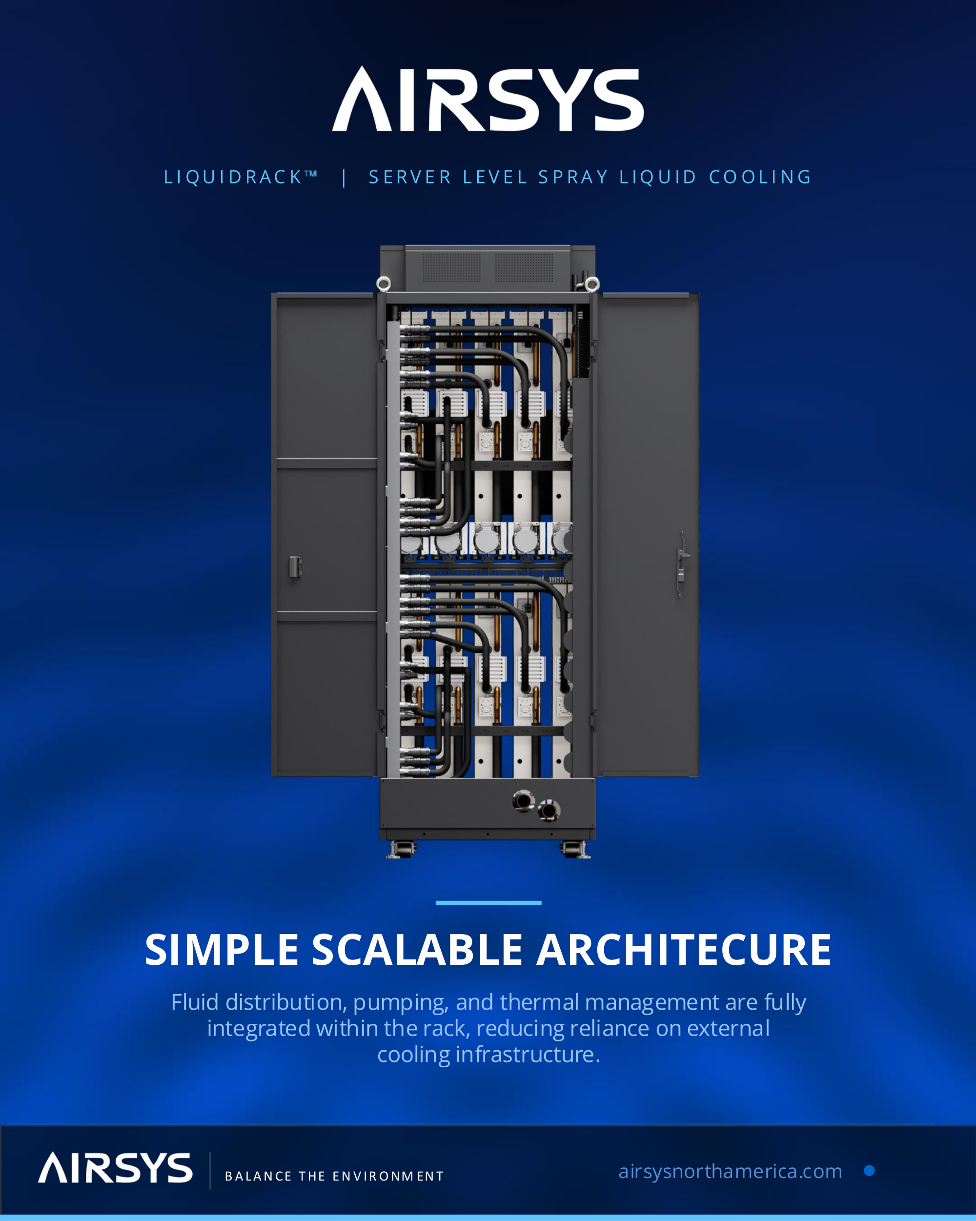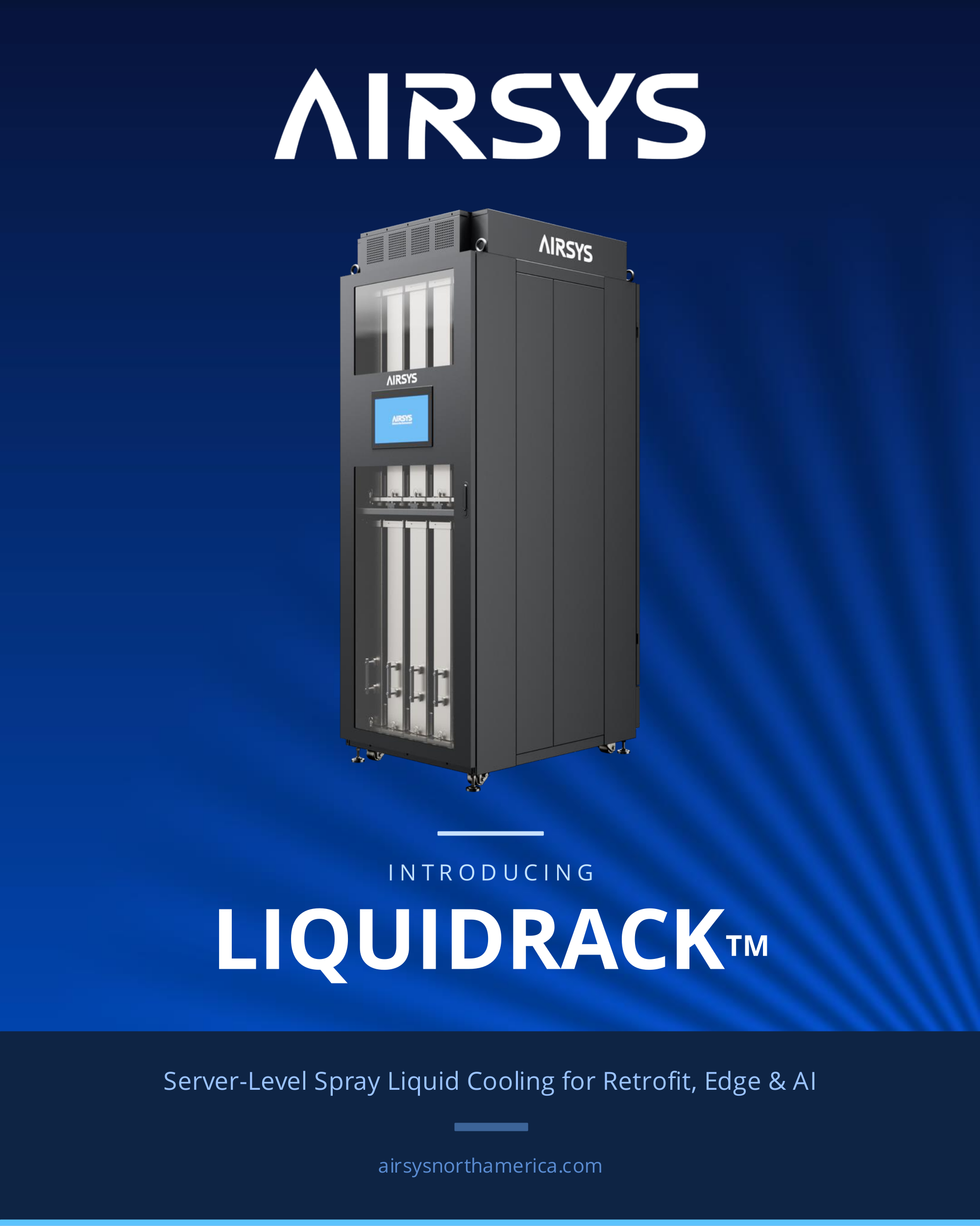 Airsys представила новую интегрированную систему жидкостного охлаждения LiquidRack, предназначенное для ИИ-сред средней плотности, ЦОД, телекоммуникаций и периферийных вычислений. LiquidRack включает модули распределения жидкости, насосы и управления непосредственно на уровне серверов. Это позволяет заполнить «пробел» между обычными системами воздушного охлаждения и крупными СЖО, которые требуют отдельные модули распределения охлаждающей жидкости (CDU).